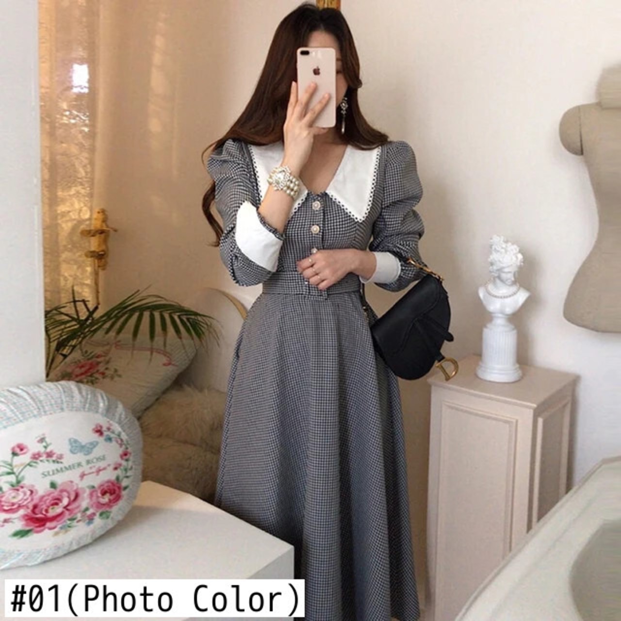 送料無料 ヴィンテージレースチェック柄シックなパフスリーブ女性のドレス女性の気質オフィスレディラペルローブスリムウエスト長袖ドレス ロング ビンテージ 会社 学校 通勤や通学にも AE008878734835482941