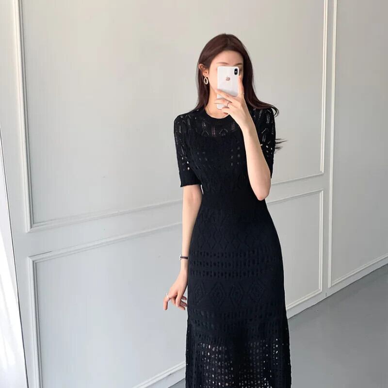 送料無料 シックな気質スリムセクシーな中空アウトドレス O ネック半袖ラップヒップニットドレスホワイトレディ夏 2022 ショート ハーフスリーブ サマー 夏物 Oネック AE00887873259740198
