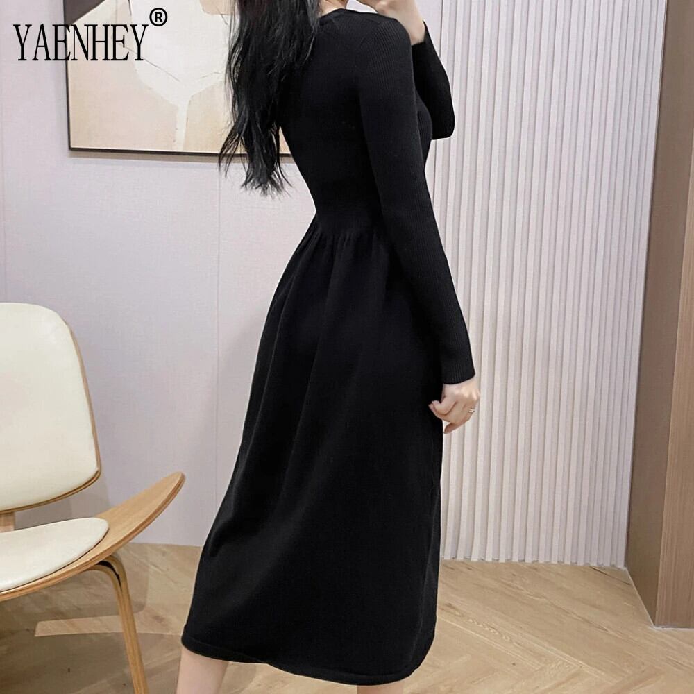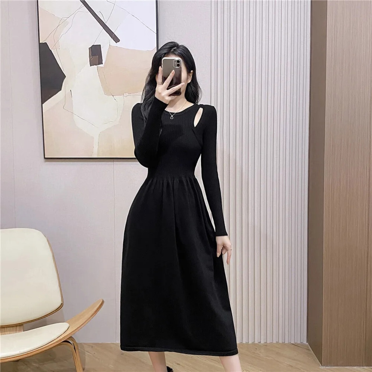 送料無料 ヴィンテージニットミディドレス女性パーティー中空アウト O ネックオフィスレディボディコンニットセータードレスブラック Oネック ビンテージ 会社 学校 通勤や通学にも AE008878770465020354