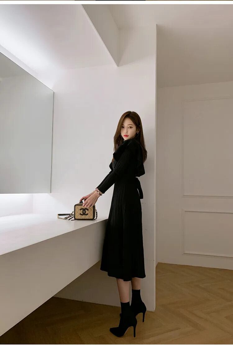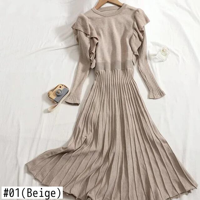 送料無料 ヴィンテージ O ネック厚みのニットロングドレススリムフルスリーブフリル女性セータードレス Vestidos 秋 2022 冬 ラッフル オータム 秋物 ウィンター 冬物 Oネック ビンテージ AE008878730460322062