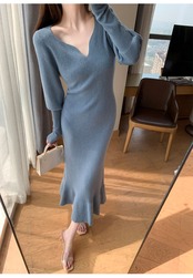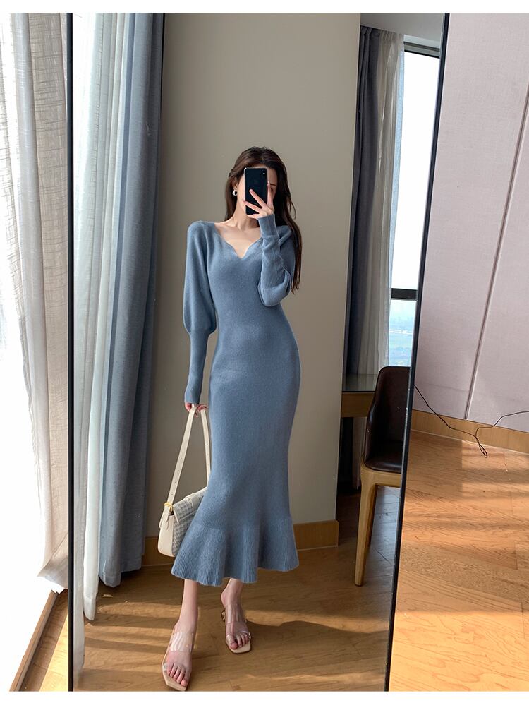 送料無料 ヴィンテージマーメイドセーターロングドレス女性 V ネックニット暖かいボディコンドレスシックな冬 2023 ウィンター 冬物 Vネック ビンテージ AE008878753649696382