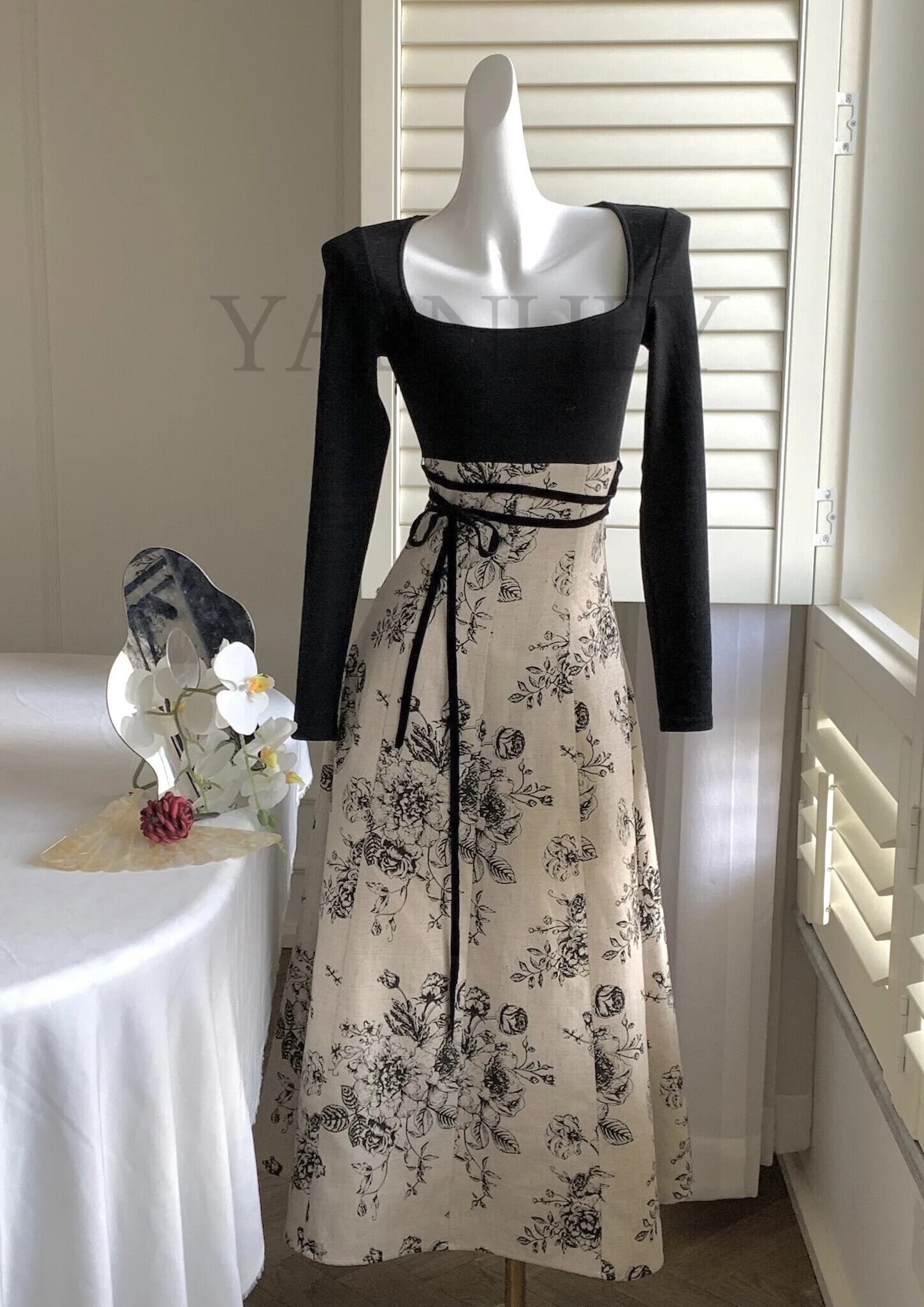 送料無料 ヴィンテージセクシーなパッチワーク花マキシドレス女性長袖スタイルスリムスクエアカラーボディコンミディドレス春 2024 ロング スプリング 春物 花柄 スクウェア ビンテージ AE008878755154984221