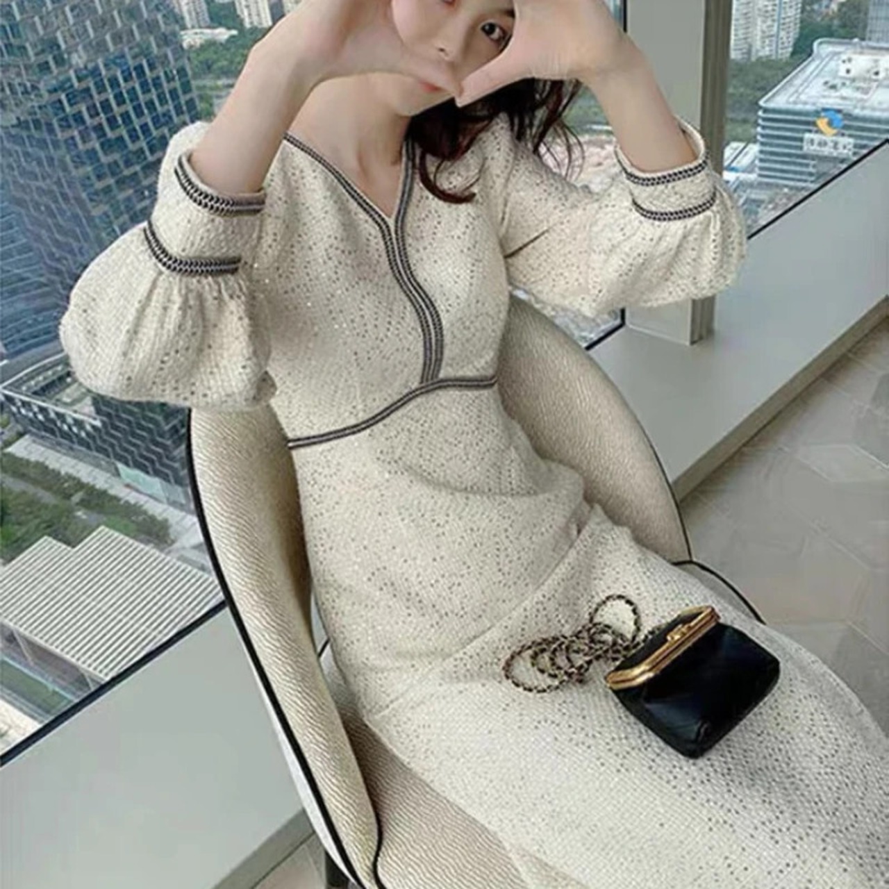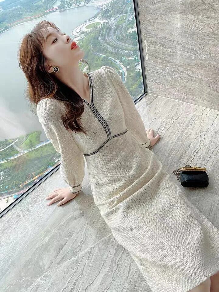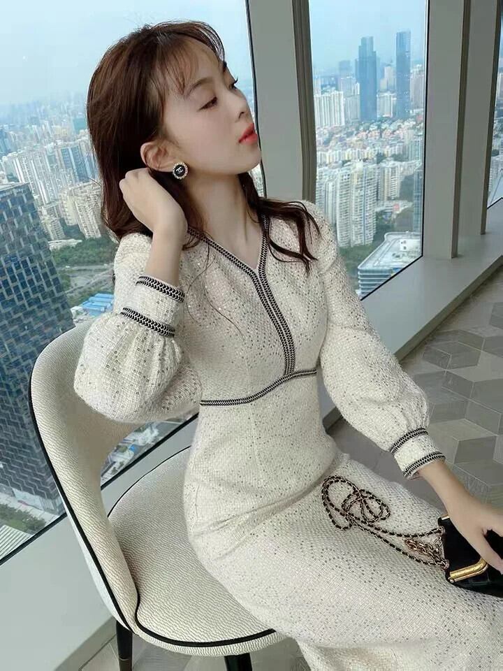 送料無料 ヴィンテージスパンコール V ネックウールマキシドレス女性パーティー気質スリムツイード長袖女性のドレス Vestidos 冬 2022 ロング ウィンター 冬物 Vネック ビンテージ AE008878715371204596