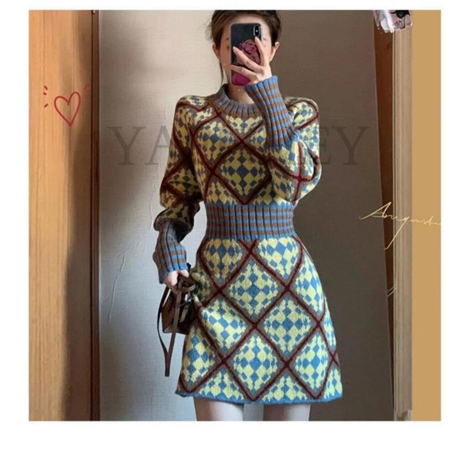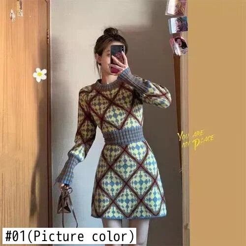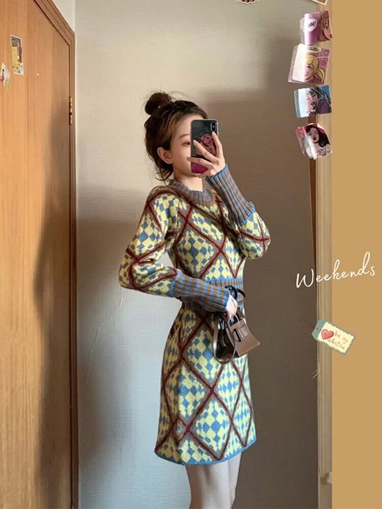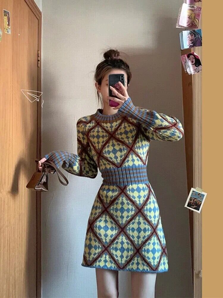 送料無料 ヴィンテージセクシーなダイヤモンドチェックストライプ O ネックプルオーバー弾性ウエストセーターニットドレス女性ミニドレス冬 2023 エラスティック 伸縮 ウィンター 冬物 Oネック ビンテージ AE008878790264544437