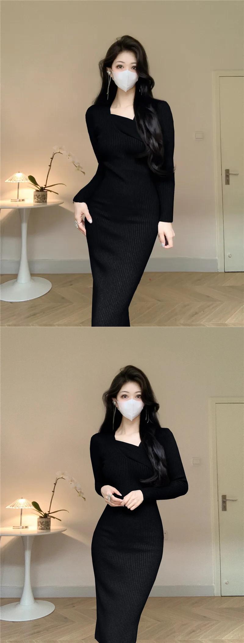 送料無料 ニットセーターミディドレス女性 V ネックウエストプルオーバーロングドレス気質通勤秋冬 2023 オータム 秋物 ウィンター 冬物 Vネック AE008878742600386584