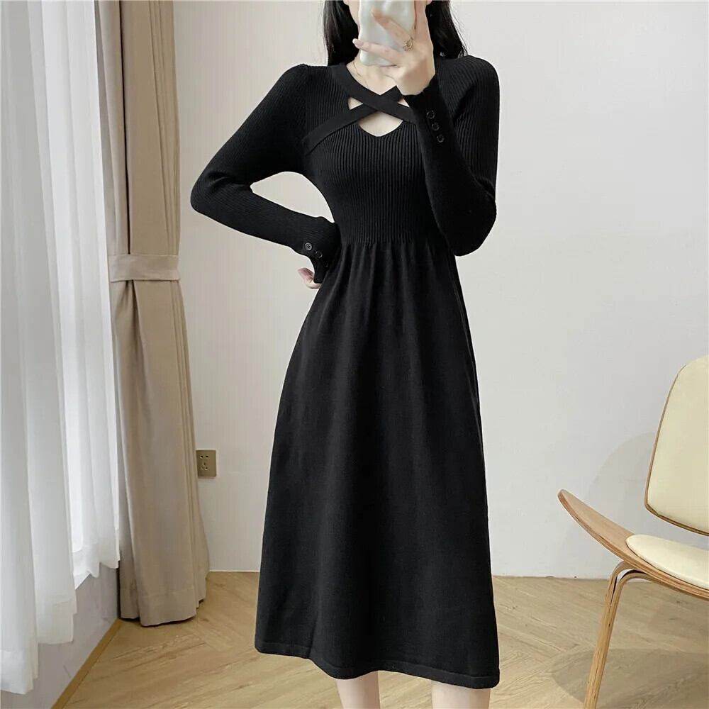 送料無料 ヴィンテージセクシーなクロス V ネックスリムドレス女性パーティー黒オフィスレディセーターニットドレス冬 2023 ライトパープル ブラック ウィンター 冬物 Vネック ビンテージ 会社 学校 通勤や通学にも AE008878728370773440