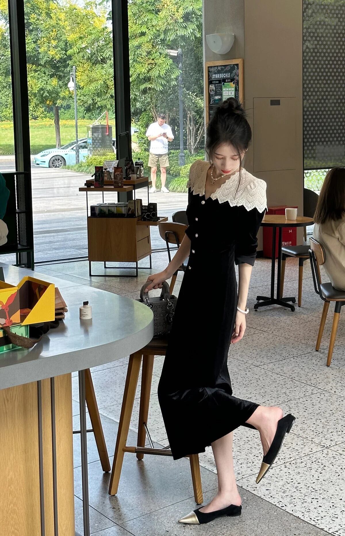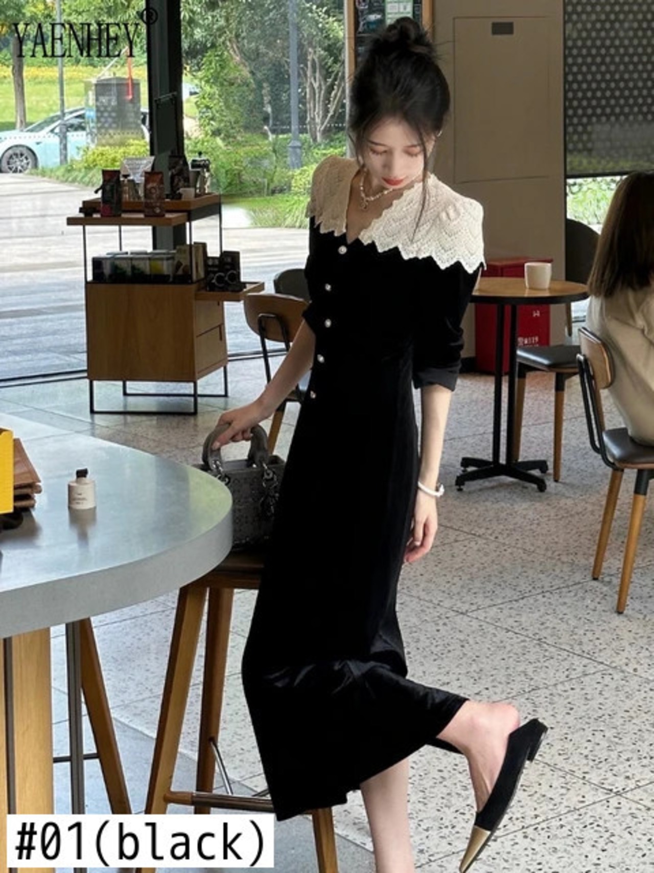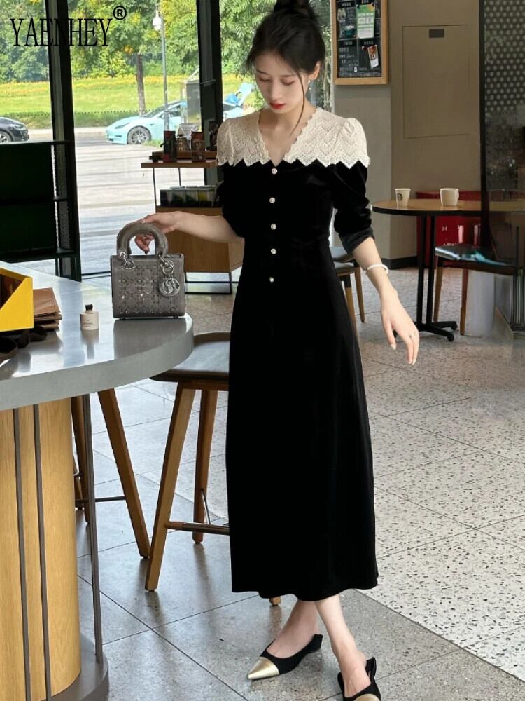 送料無料 ヴィンテージパッチワークブラックベルベットミディドレス女性パーティーウエディング長袖スリムワンピースドレス秋 ロング オータム 秋物 ビンテージ AE008878778502458847