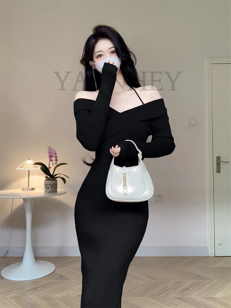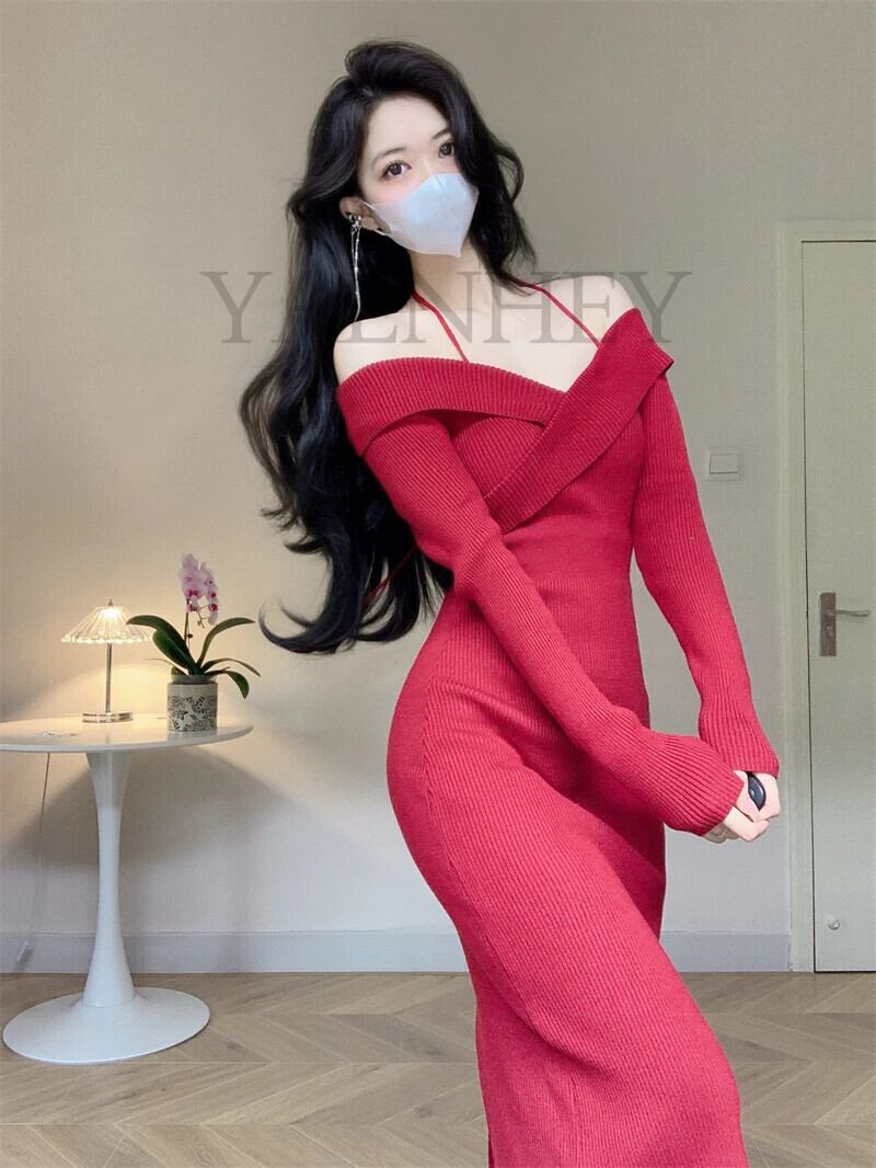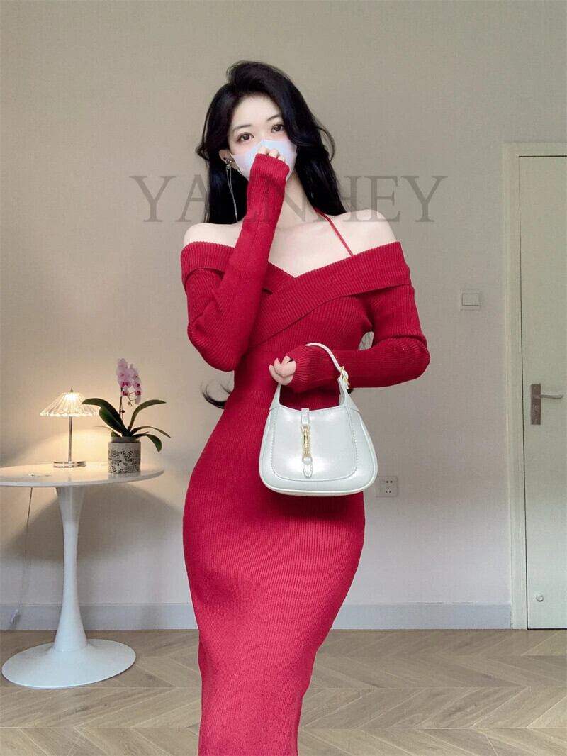 送料無料 セクシーなスラッシュネックオフショルダーニットセーターマキシドレス女性ネックマウントレッドボディコンミディドレス冬 2023 ウィンター 冬物 AE008878736600630648