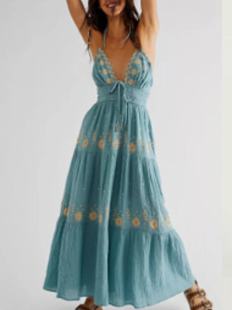 送料無料 夏の女性のドレス綿セクシーなマキシドレス女性 Vestidos デボヘミアン背中の開いたビーチホリデードレス花の誕生日ローブ コットン サマー 夏物 フラワーデザイン AE0807759942119936