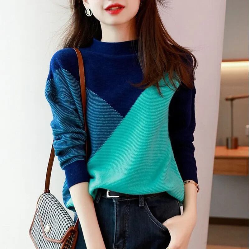 送料無料 セーター女性 2023 秋冬コントラストニットウェア保温セーター O ネック長袖ニットプルオーバー ロング オータム 秋物 ウィンター 冬物 Oネック AE0807766513590306