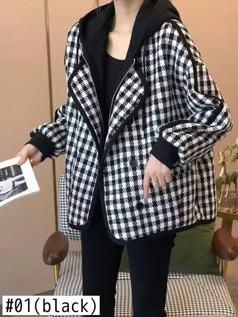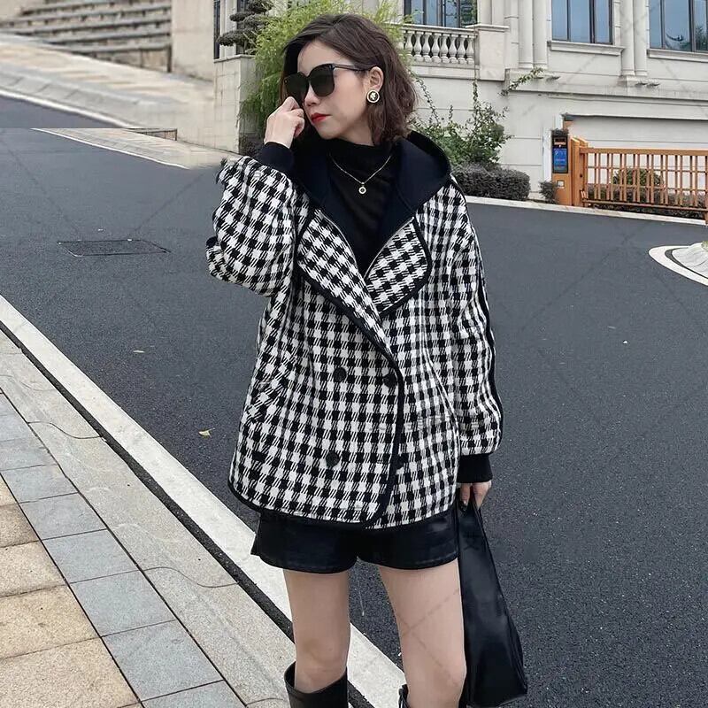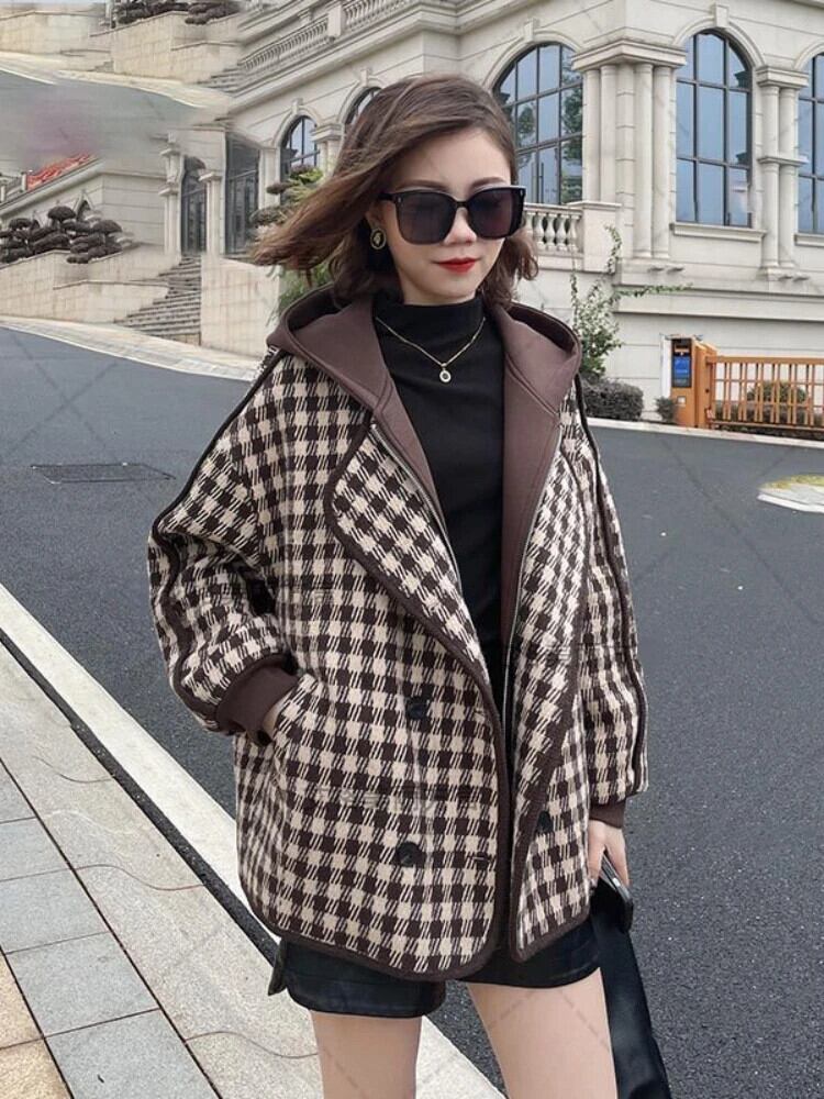 送料無料 格子コートの女性の冬のジャケット 2023 フード付き偽二枚二列ボタン緩い暖かいコート女性 ウィンター 冬物 AE0807746935309418
