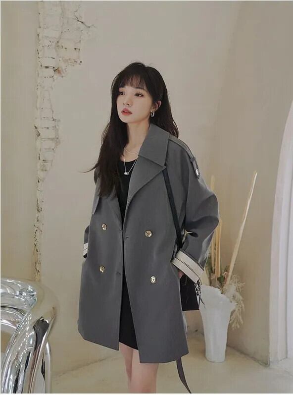 送料無料 女性コート 2023 冬服ジャケットトレンチ固体長袖トップスラペル二列ボタンショートウインドブレーカー作業 ロング ウィンター 冬物 ソリッドカラー AE0807738224249478