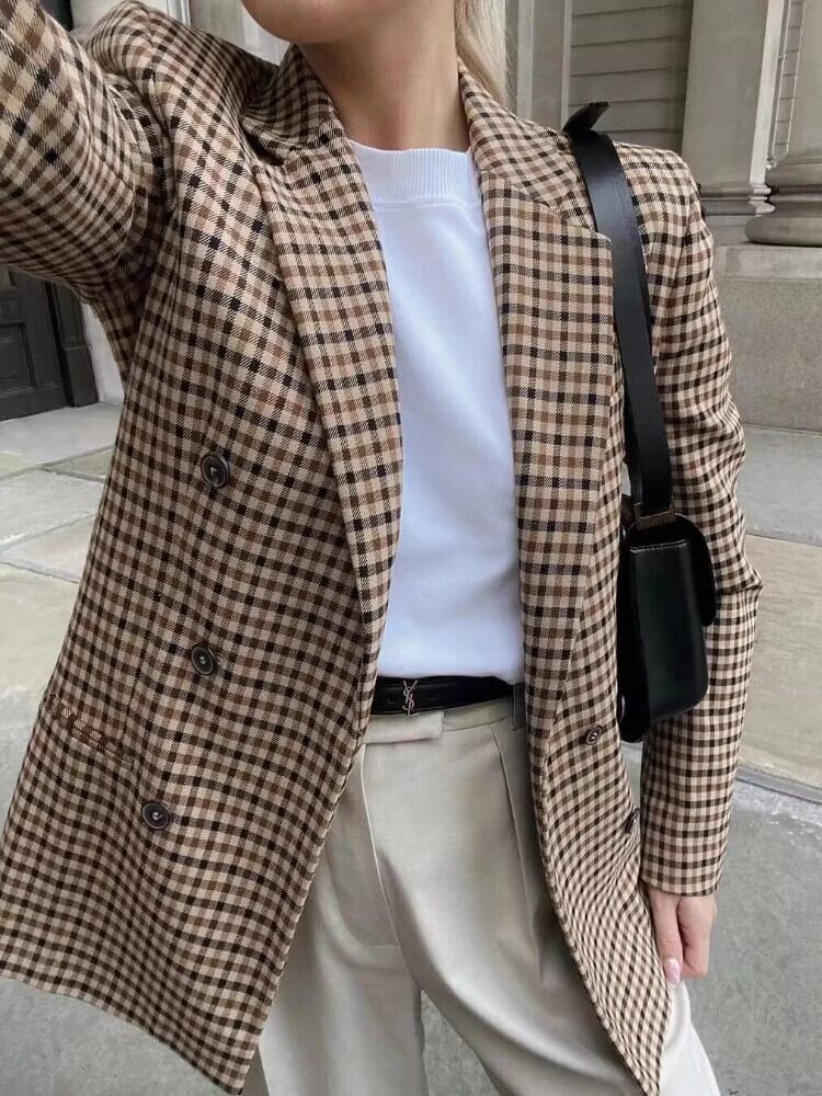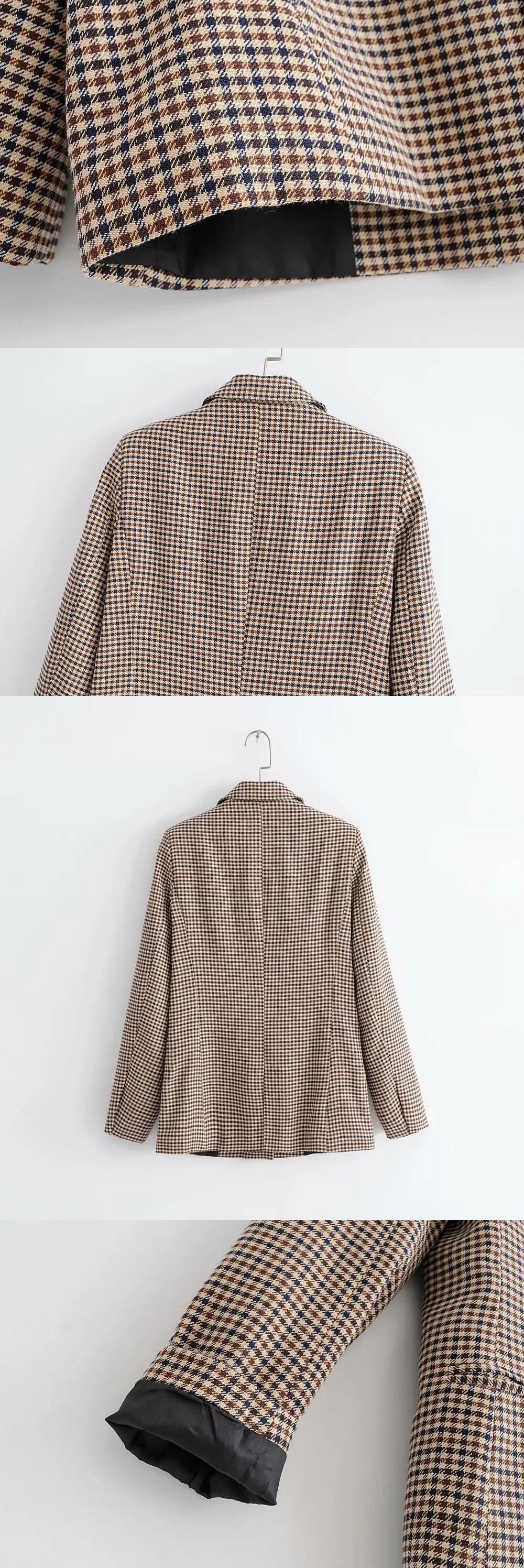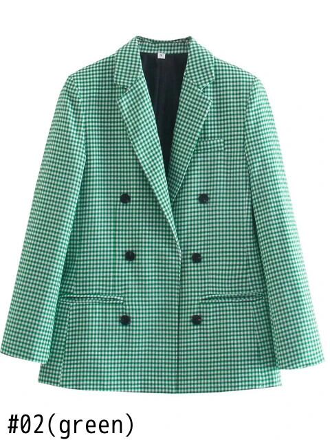 送料無料 秋のチェック柄ブレザー女性長袖オフィス服ジャケットポケットダブルブレストコート特大ブレザートップス ロング オータム 秋物 会社 学校 通勤や通学にも AE0807725964654411
