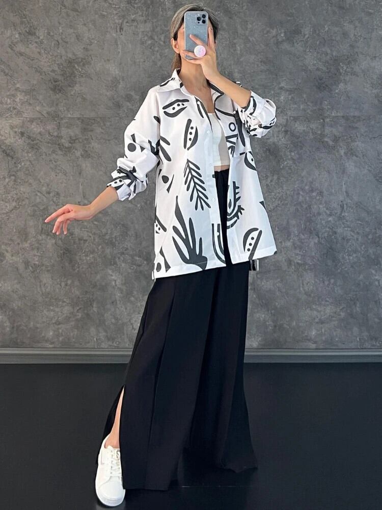 送料無料 パンツセット 2023 夏長袖トッププリントシャツウエストサイドスプリットワイドレッグパンツルーズレディースセット ロング サマー 夏物 ワイドパンツ AE0807718094584975