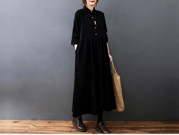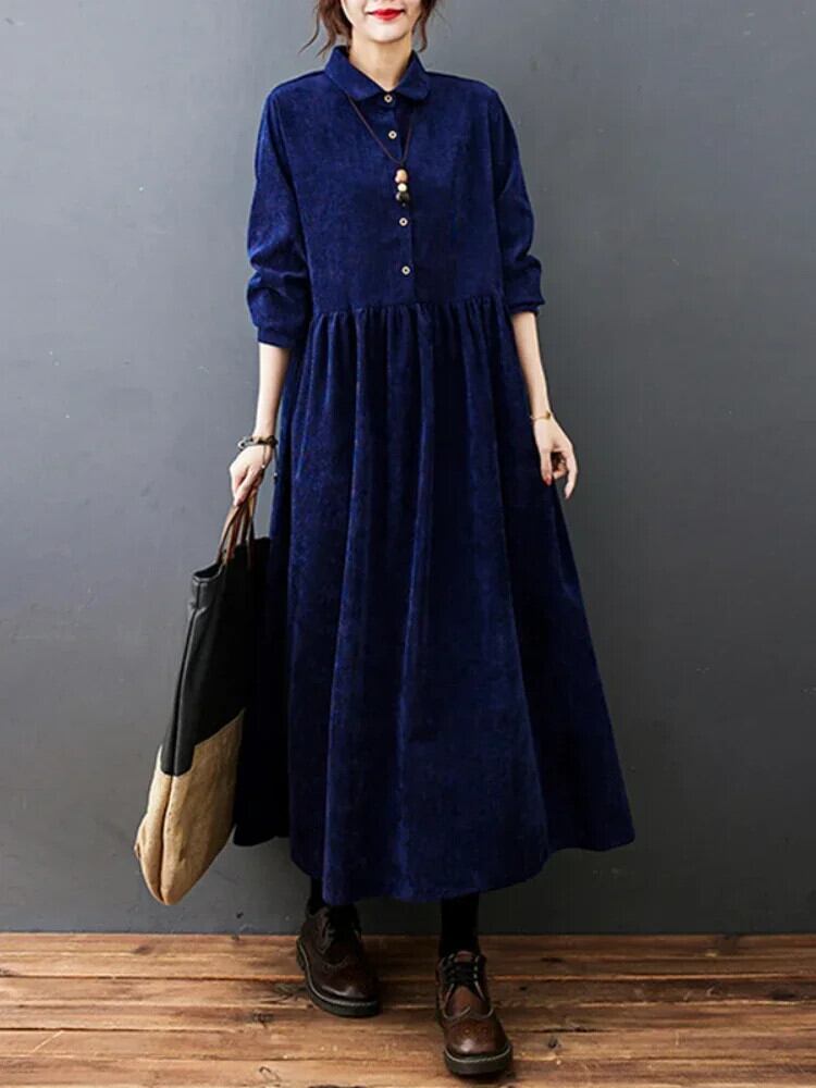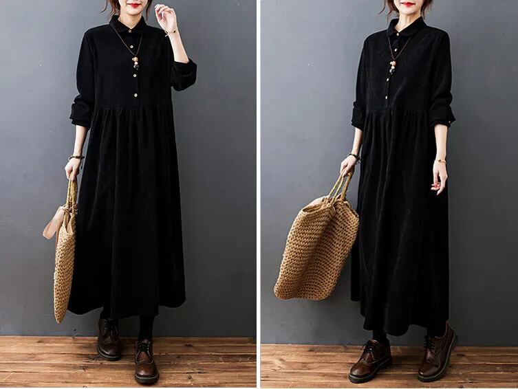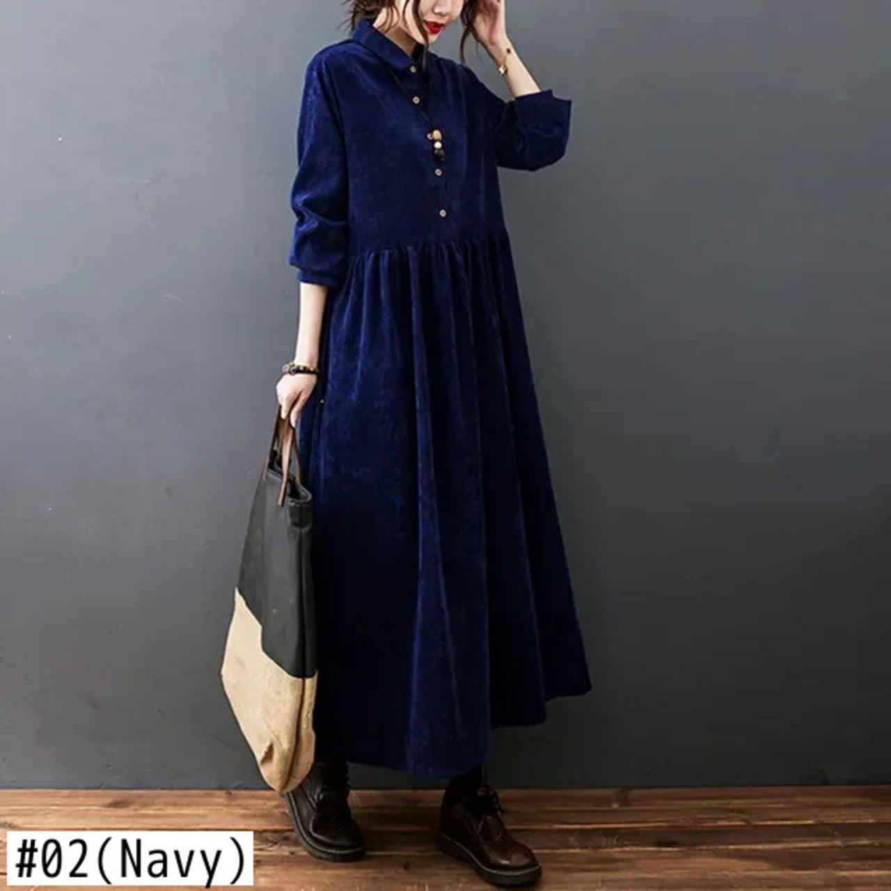 送料無料 コーデュロイ冬秋長袖ヴィンテージドレスターンダウン襟ブラウスドレス女性ドレス ロング オータム 秋物 ウィンター 冬物 ビンテージ AE0807735854541892
