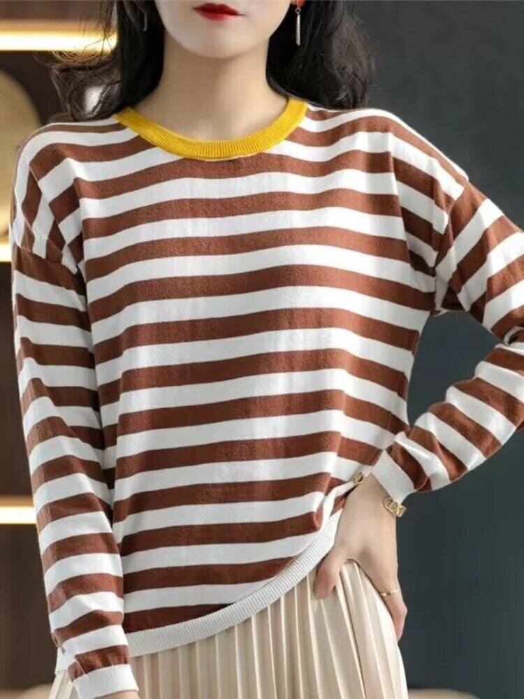 送料無料 春秋の女性の O ネックセーター暖かいプルオーバートップジャンパー赤ルース女性のトップレトロストライプセーター レッド スプリング 春物 オータム 秋物 Oネック AE0807769114510265