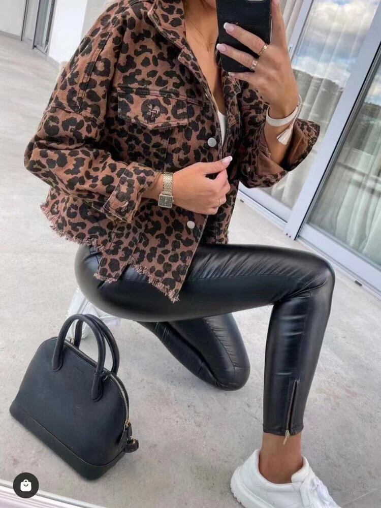 送料無料 秋のジャケットの女性 2023 ヒョウジャケット女性ヴィンテージジーンズコートルーズ長袖トップ服ストリート ロング オータム 秋物 ビンテージ AE0807795261185195