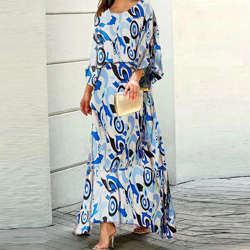 送料無料 2023 ドレス女性ツーピースセットクルーネックプリントロングランタンスリーブトップドレスストリートビーチスーツ AE0807755869557484