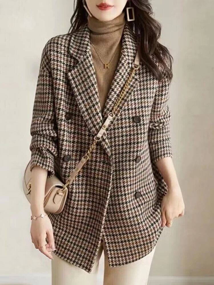 送料無料 ブレザー女性スーツの襟千鳥チェック柄ウール秋冬ジャケットミッドレングスコート女性のトップス オータム 秋物 ウィンター 冬物 AE0807781257615400