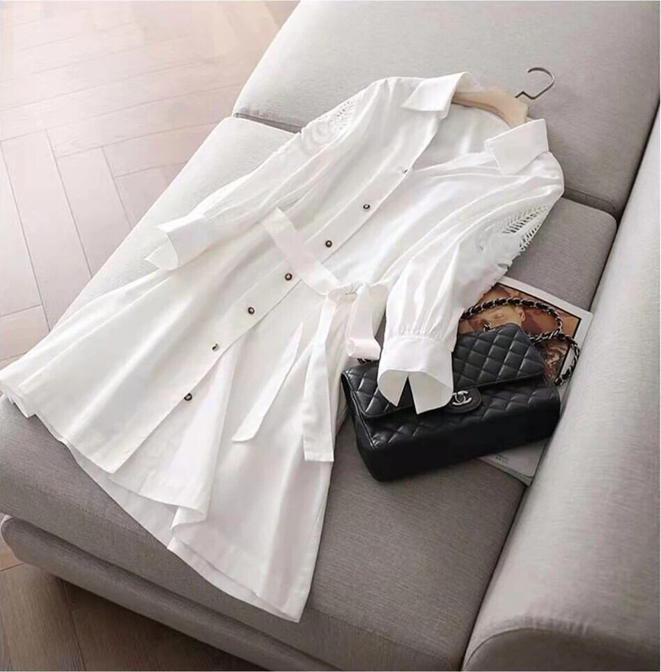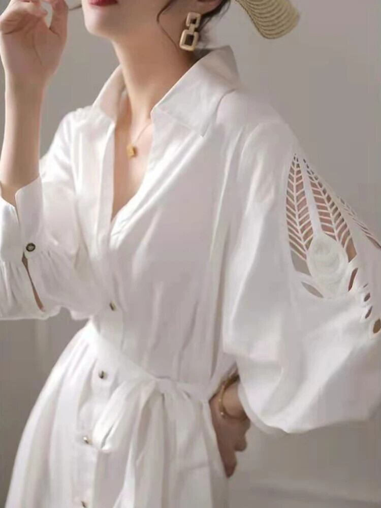 送料無料 女性ドレス 2023 春夏ポロ固体長袖シャツ中空アウトレースアップ白ドレスルーズストリート ロング ホワイト スプリング 春物 サマー 夏物 ソリッドカラー AE0807767692198959