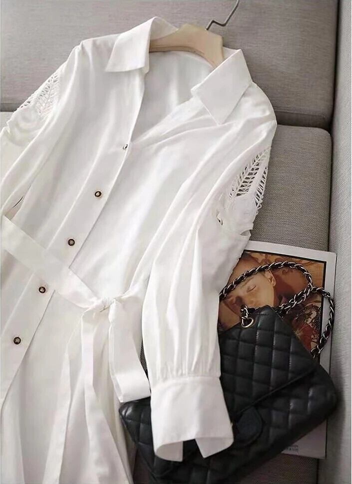 送料無料 女性ドレス 2023 春夏ポロ固体長袖シャツ中空アウトレースアップ白ドレスルーズストリート ロング ホワイト スプリング 春物 サマー 夏物 ソリッドカラー AE0807767692198959 | 女性の為の通販サイト-fashion navi