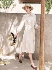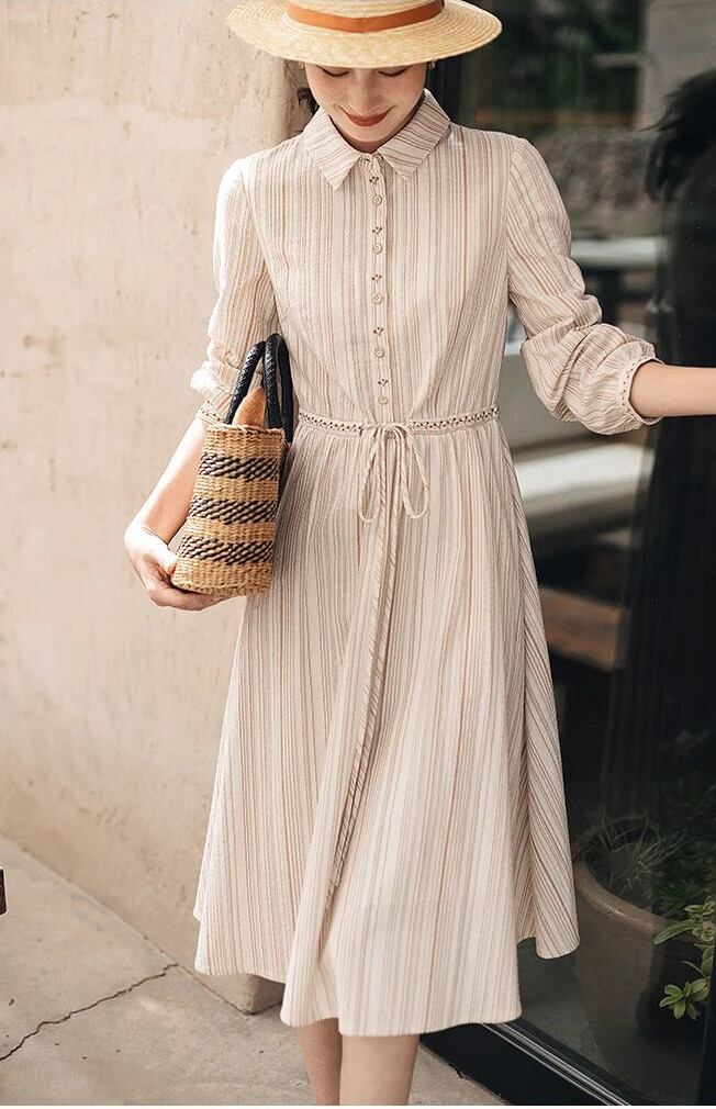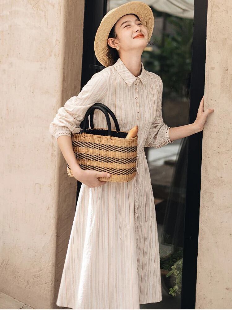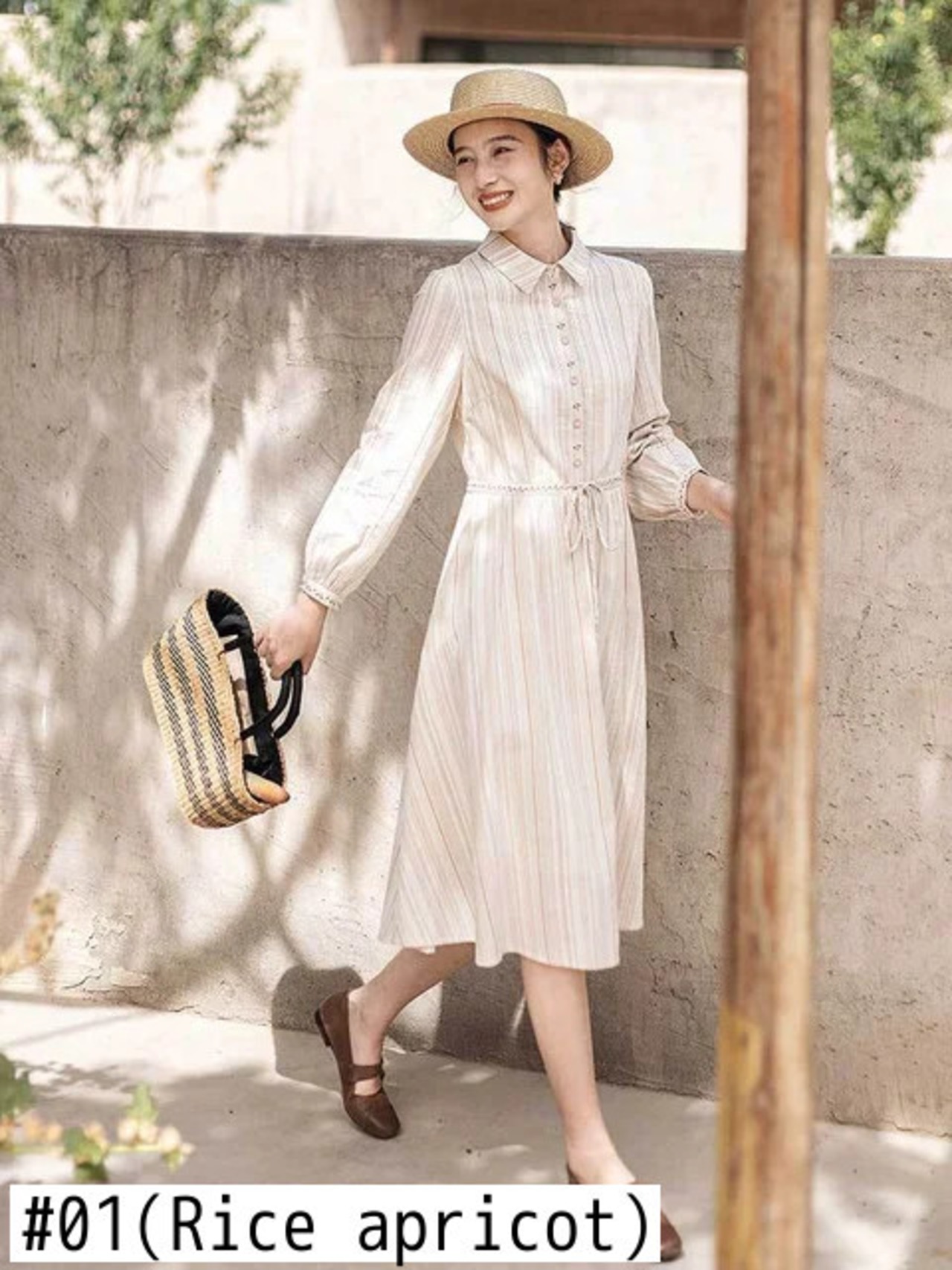 送料無料 シャツドレス レディースストライプドレス 長袖トップス 女性シャツ オフィスブラウス ボタンアップシャツ ロング 会社 学校 通勤や通学にも AE0807788804556306