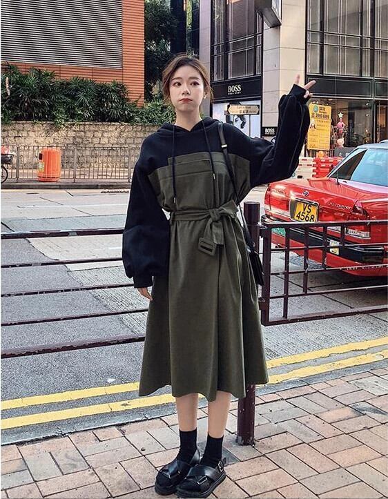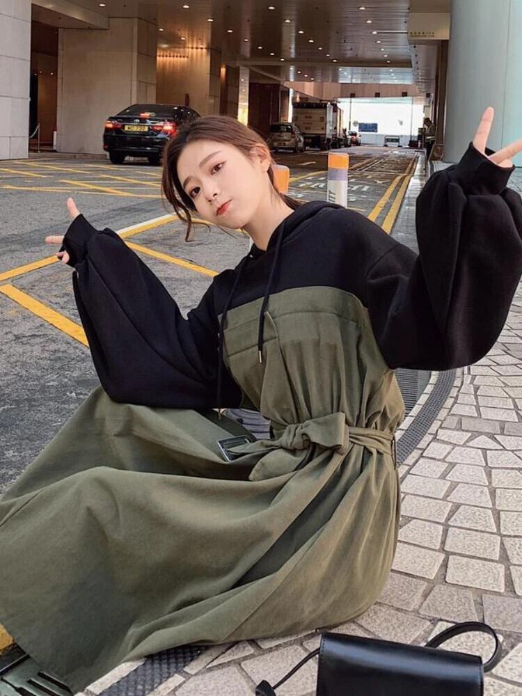 送料無料 ドレス女性 2023 春秋グリーンロングドレスルーズローブフード付きパーティードレスストリートヴィンテージドレス スプリング 春物 オータム 秋物 ビンテージ AE0807775542520283