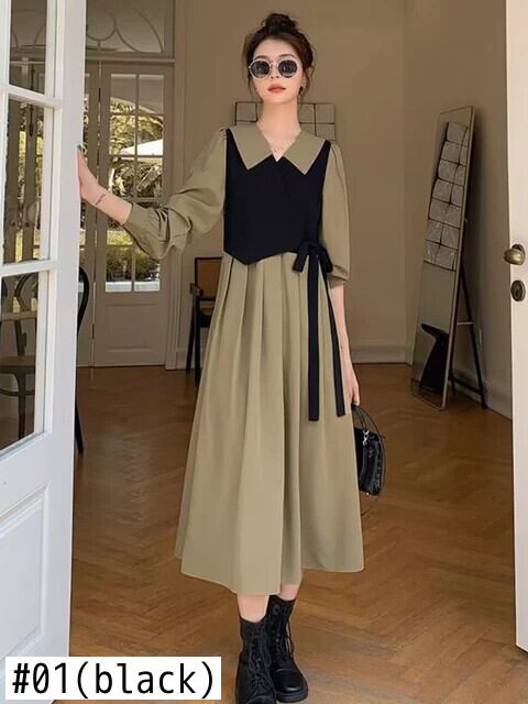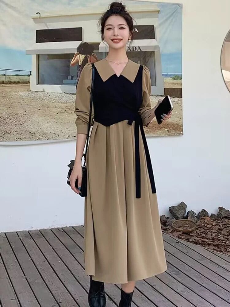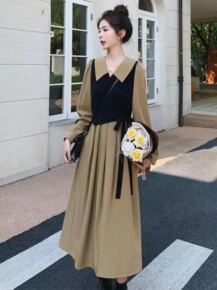 送料無料 ドレス女性 2023 春秋のロングドレスルース偽二枚ドレスストリートヴィンテージドレスローブ スプリング 春物 オータム 秋物 ビンテージ AE0807723387107043
