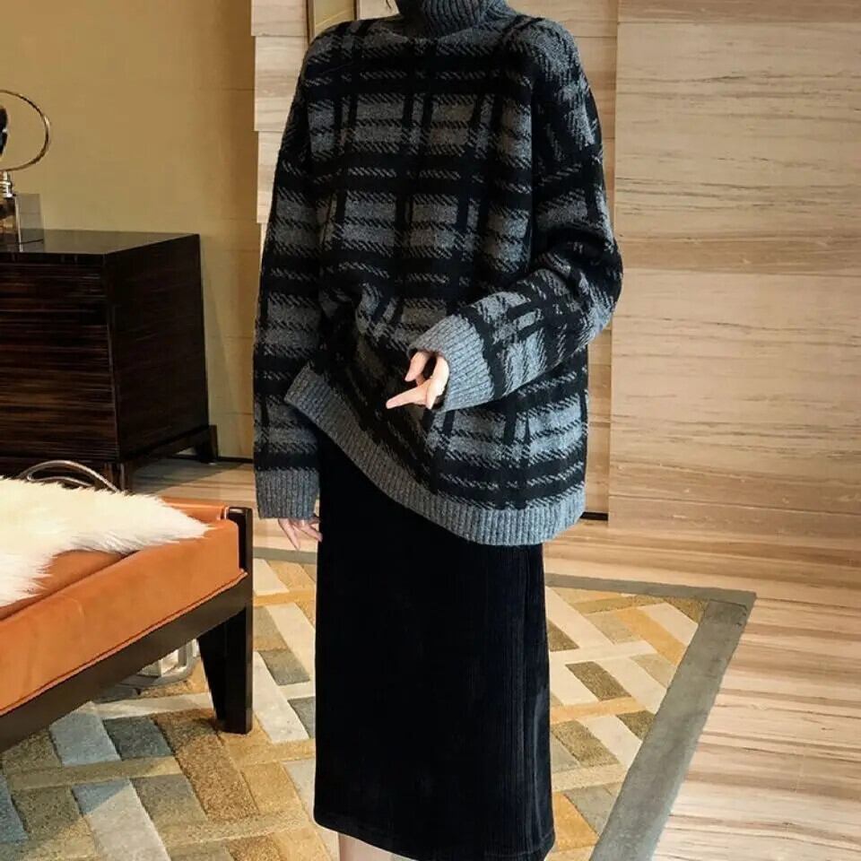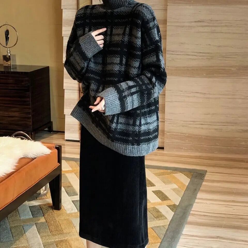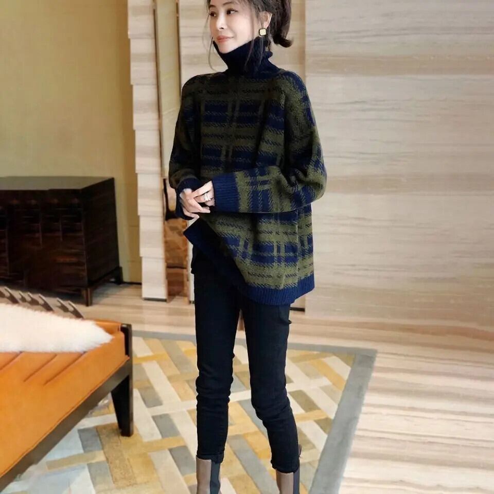 送料無料 女性セーター 2023 秋冬チェック柄タートルネックプルオーバー長袖トップヴィンテージニット ロング オータム 秋物 ウィンター 冬物 ビンテージ AE0807771010478232