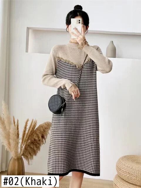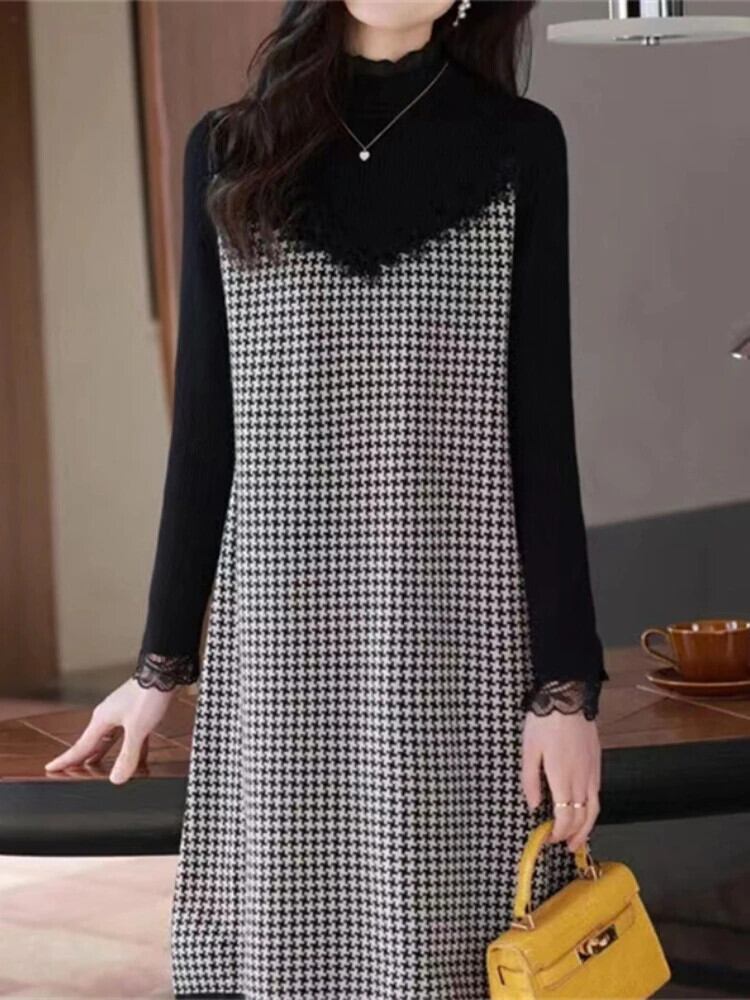 送料無料 ドレス女性ハーフカラーセーター秋冬ミディアムロング底セーター黒ニットプルオーバードレス ブラック オータム 秋物 ウィンター 冬物 AE0807788033252183