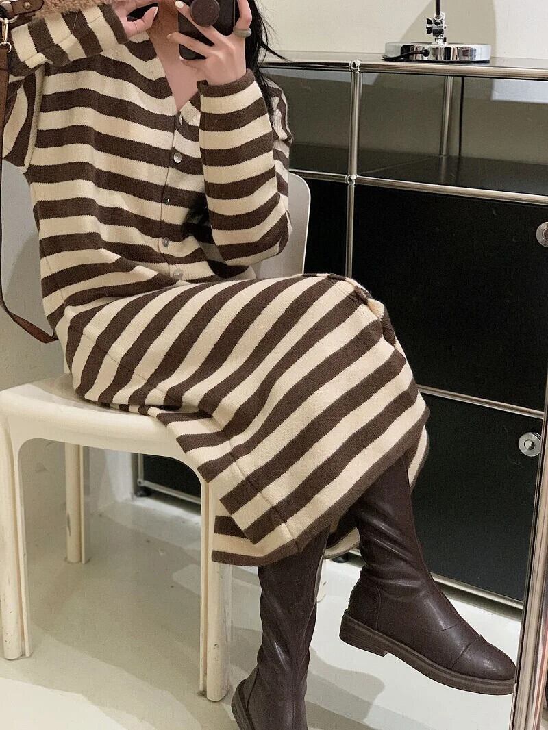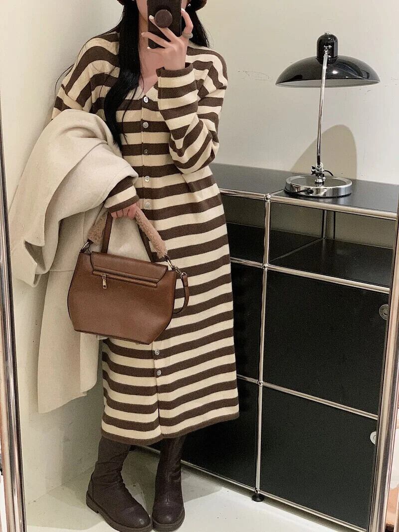 送料無料 ドレス女性 2023 秋の女性のセーターロングドレスストライプニットカーディガン女性ルーズオーバーコート オータム 秋物 AE0807762969414304 | 女性の為の通販サイト-fashion navi