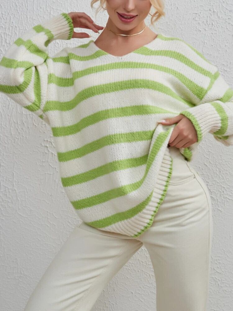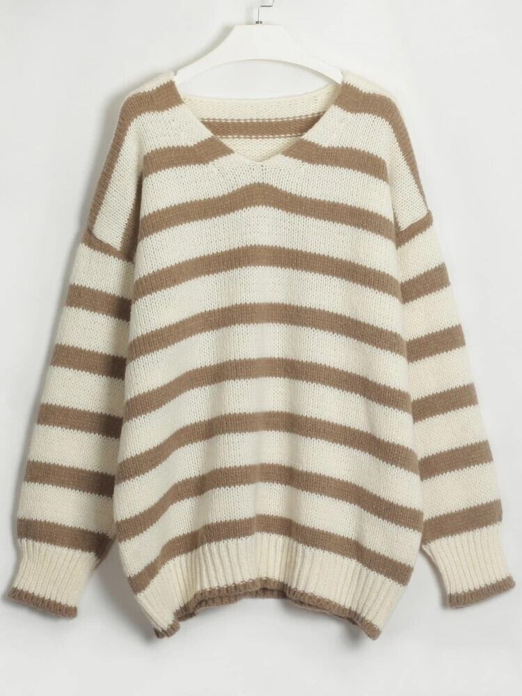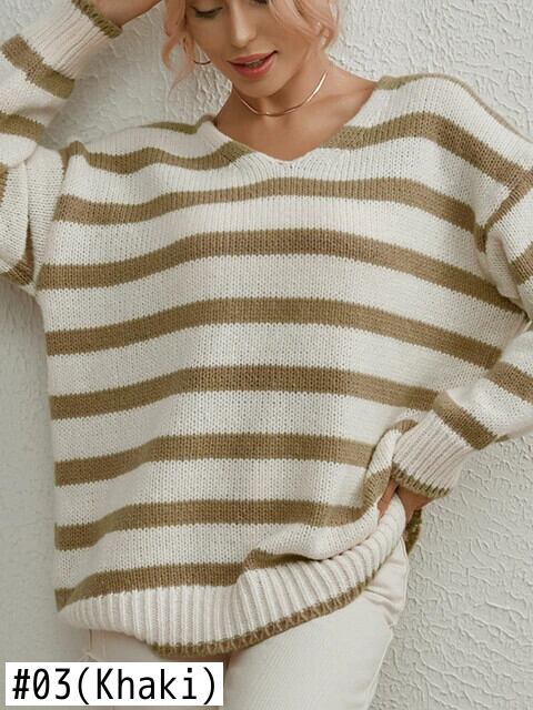 送料無料 女性のセータージャンパー秋冬 V ネックストライプブラウスルーズ長袖トップスカーキプルオーバーセーター ロング オータム 秋物 ウィンター 冬物 Vネック AE0807759619632787