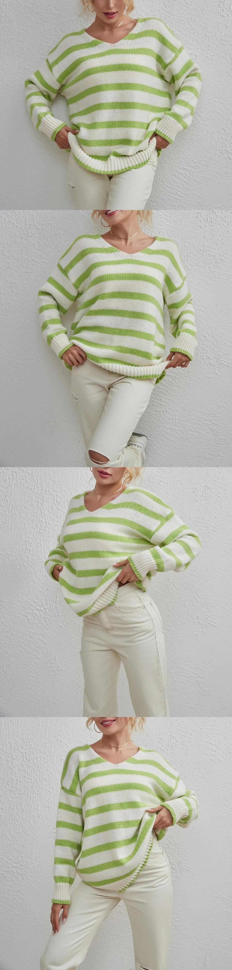 送料無料 女性のセータージャンパー秋冬 V ネックストライプブラウスルーズ長袖トップスカーキプルオーバーセーター ロング オータム 秋物 ウィンター 冬物 Vネック AE0807759619632787 | 女性の為の通販サイト-fashion navi
