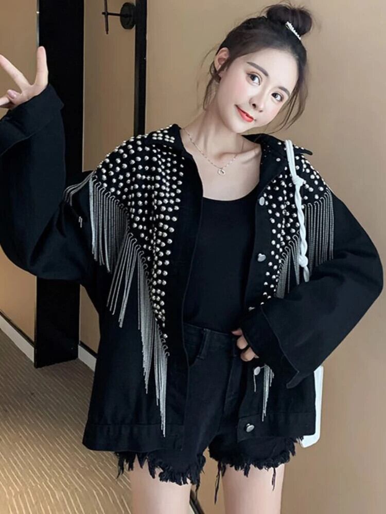 送料無料 秋の女性のデニムジャケットリベットテルオーバーコートジーンズジャケットトップスルーズコートシングルブレスト黒生き抜くストリート ブラック オータム 秋物 AE0807718614546027 | 女性の為の通販サイト-fashion navi