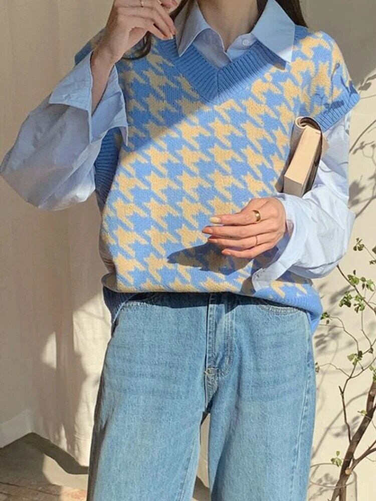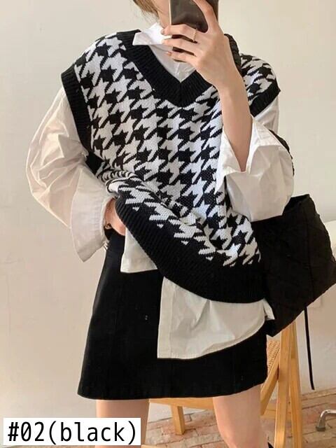 送料無料 女性のノースリーブベスト 2023 ルーズニット女性格子ヴィンテージ V ネックプルオーバーチョッキ Vネック ビンテージ AE0807783007381327