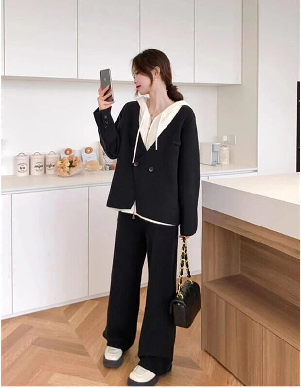 送料無料 ツーピースパンツセット女性秋フード付きカーディガンセーターワイドレッグパンツセットニットスーツマッチングセット女性用 オータム 秋物 ワイドパンツ AE0807733557094133