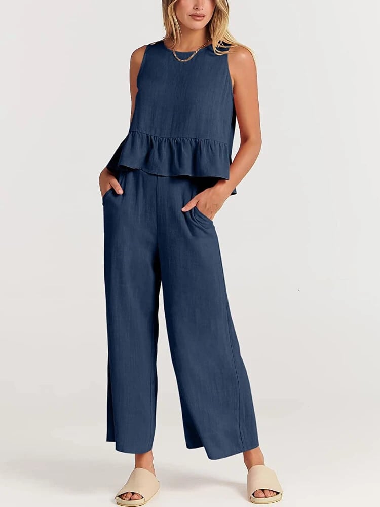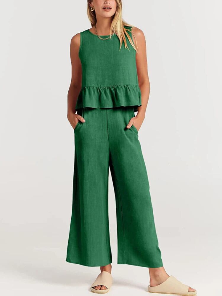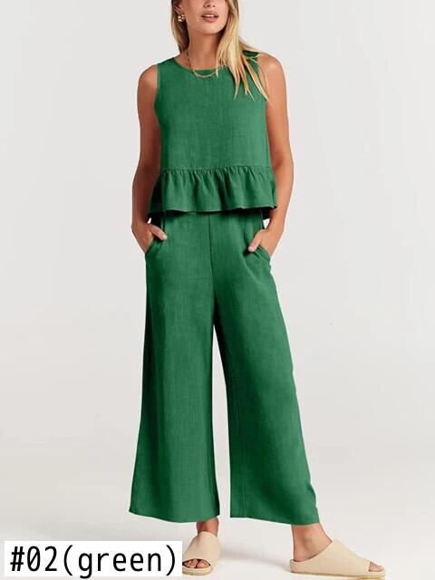 送料無料 ツーピースセット女性衣装 2023 夏の女性のツーピースルーズレジャーノースリーブプリーツベスト Tシャツワイドレッグパンツスーツ サマー 夏物 AE0807761220844467