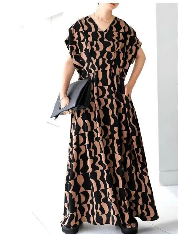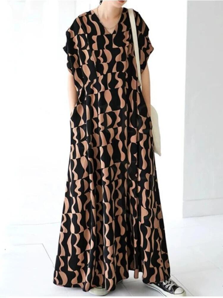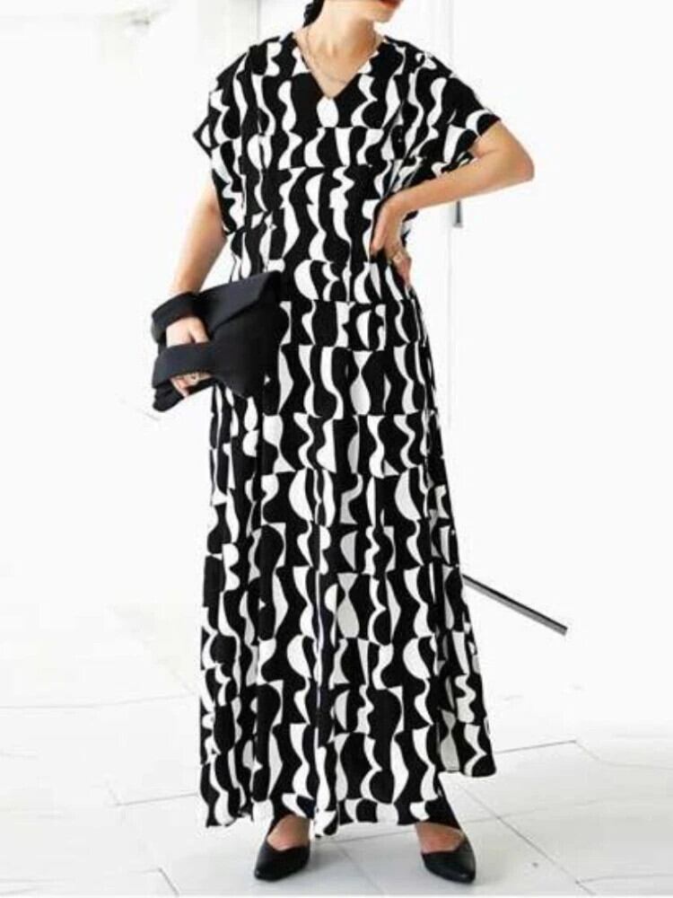 送料無料 黒のドレスの女性ローブ印刷マキシドレス 2023 半袖ルーズ V ネックかわいい女性のドレス mal ショート ブラック ハーフスリーブ Vネック AE0807759528792453