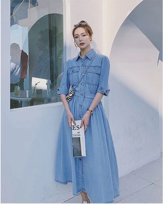 送料無料 春夏ウエスト女性ヴィンテージドレスデニムプリーツドレス女性ブルーシャツロングドレス スプリング 春物 サマー 夏物 ビンテージ AE0807763351027625 | 女性の為の通販サイト-fashion navi