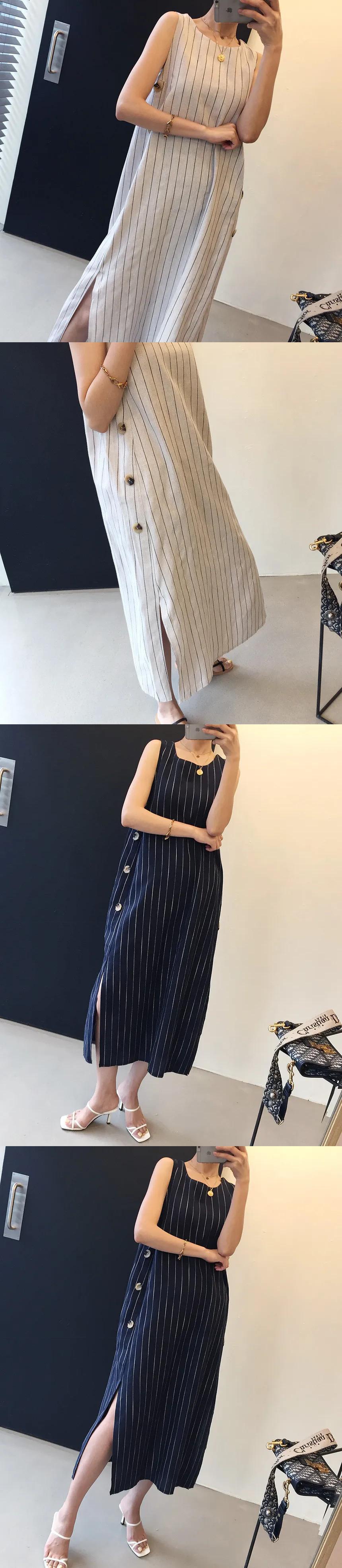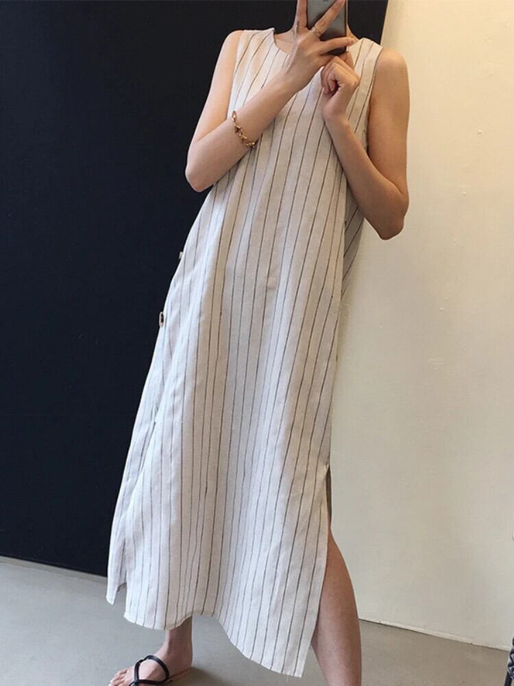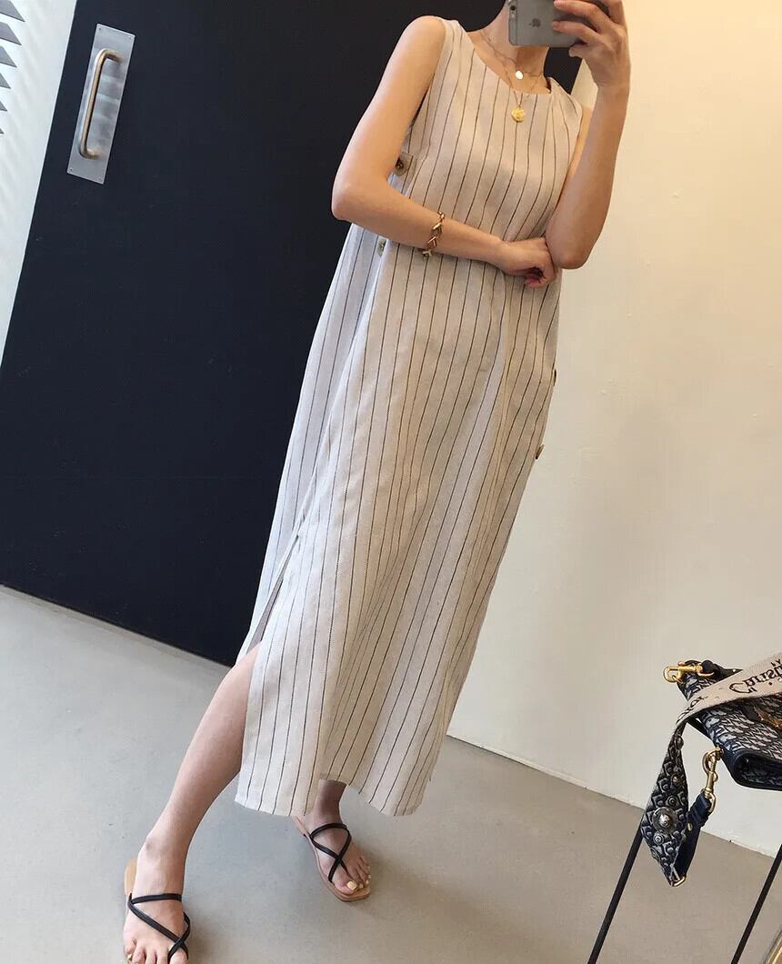 送料無料 ドレス女性 2023 夏ルーズストライプロングドレスノースリーブストリートローブスタイルロング女性の サマー 夏物 AE0807734135254907