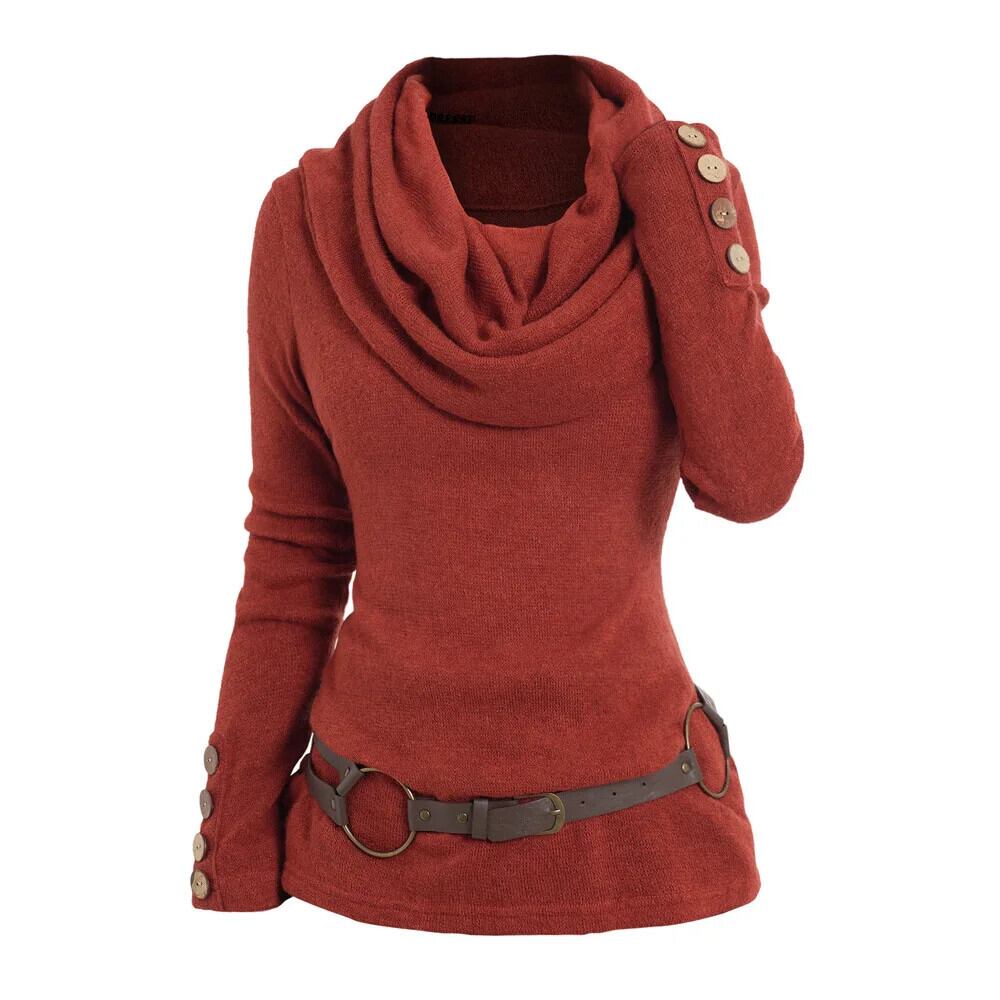 送料無料 女性ニットトップとベルトニットウェアカウルネックベルト付きニットトップス無地折り返しニット Tシャツ ハーネス ソリッドカラー AE1212665655648628821170