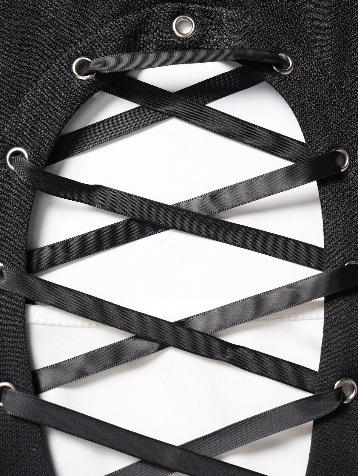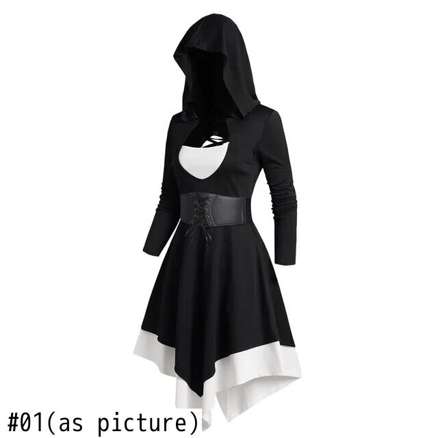 送料無料 カットアウトレースアップフード付きドレスゴス長袖ウエストベルト付き非対称プルオーバー女性 ロング ハーネス AE1212665655635640509238