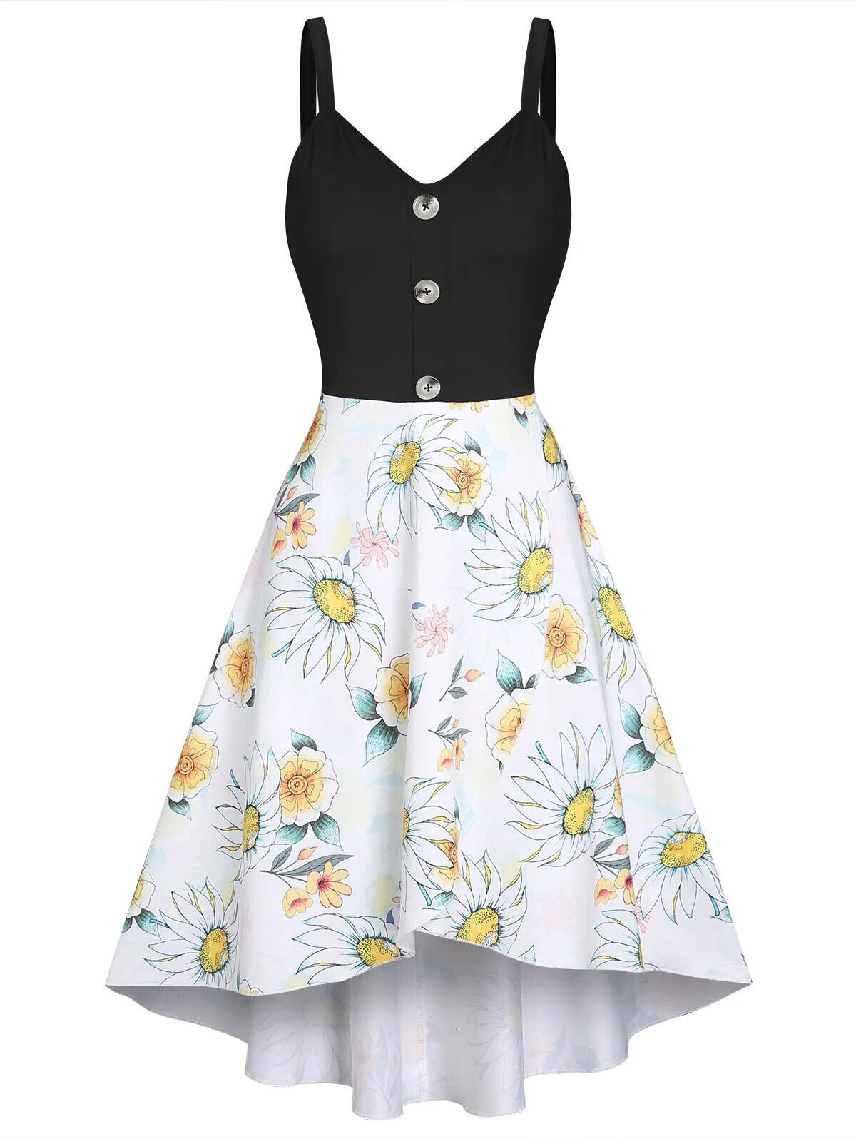 送料無料 ひまわり花モックボタンロードレスディップヘムレディースミディ V ネックローブフレッシュスタイル A ライン Vestido Feminino 花柄 Vネック Aライン フラワーデザイン AE1212665655698865229268