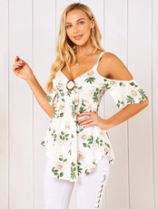 送料無料 夏フラワープリント O リングコールドショルダータンクトップ休暇スタイリング V ネックビーチトップス女性 サマー 夏物 Vネック 指輪 フラワーデザイン AE1212665655681695057701