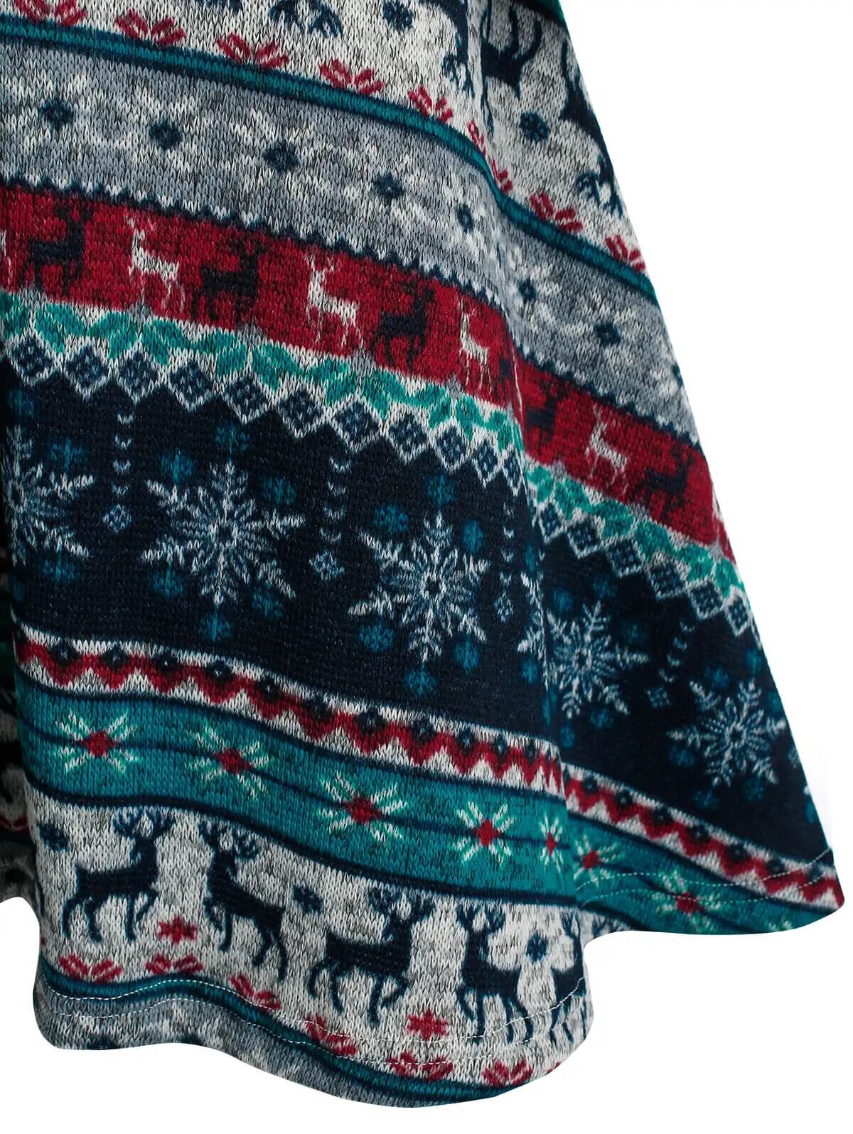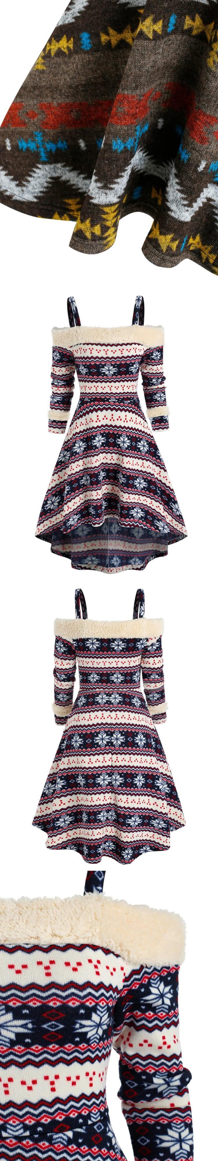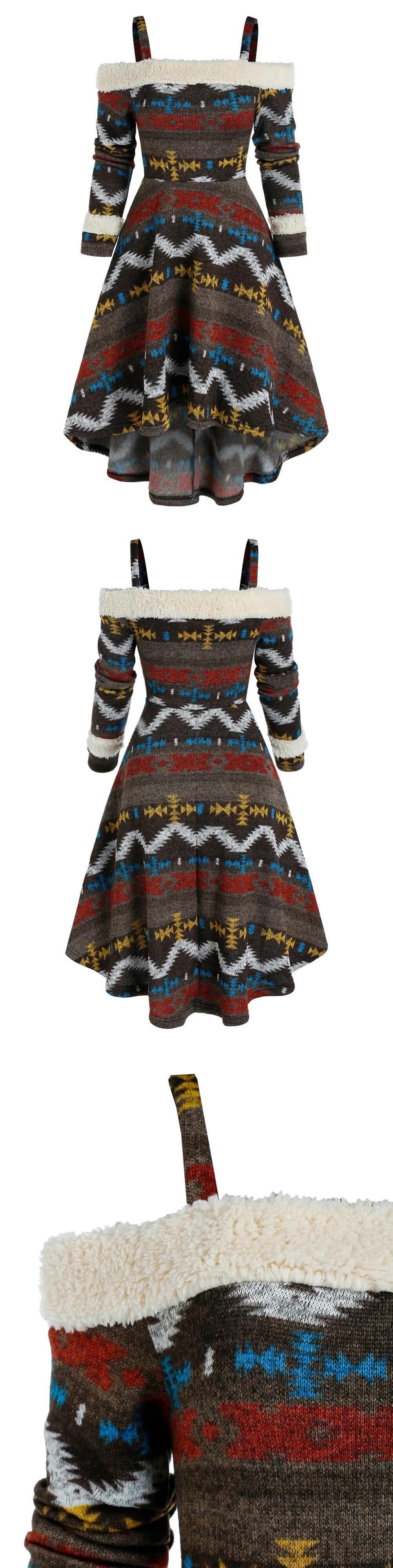 送料無料 長袖セーター暖かい冬エスニックスタイルディップヘムファジーニットコールドショルダートライバルプリントロー膝丈クリスマスドレス ロング ウィンター 冬物 AE1212665655612954114644