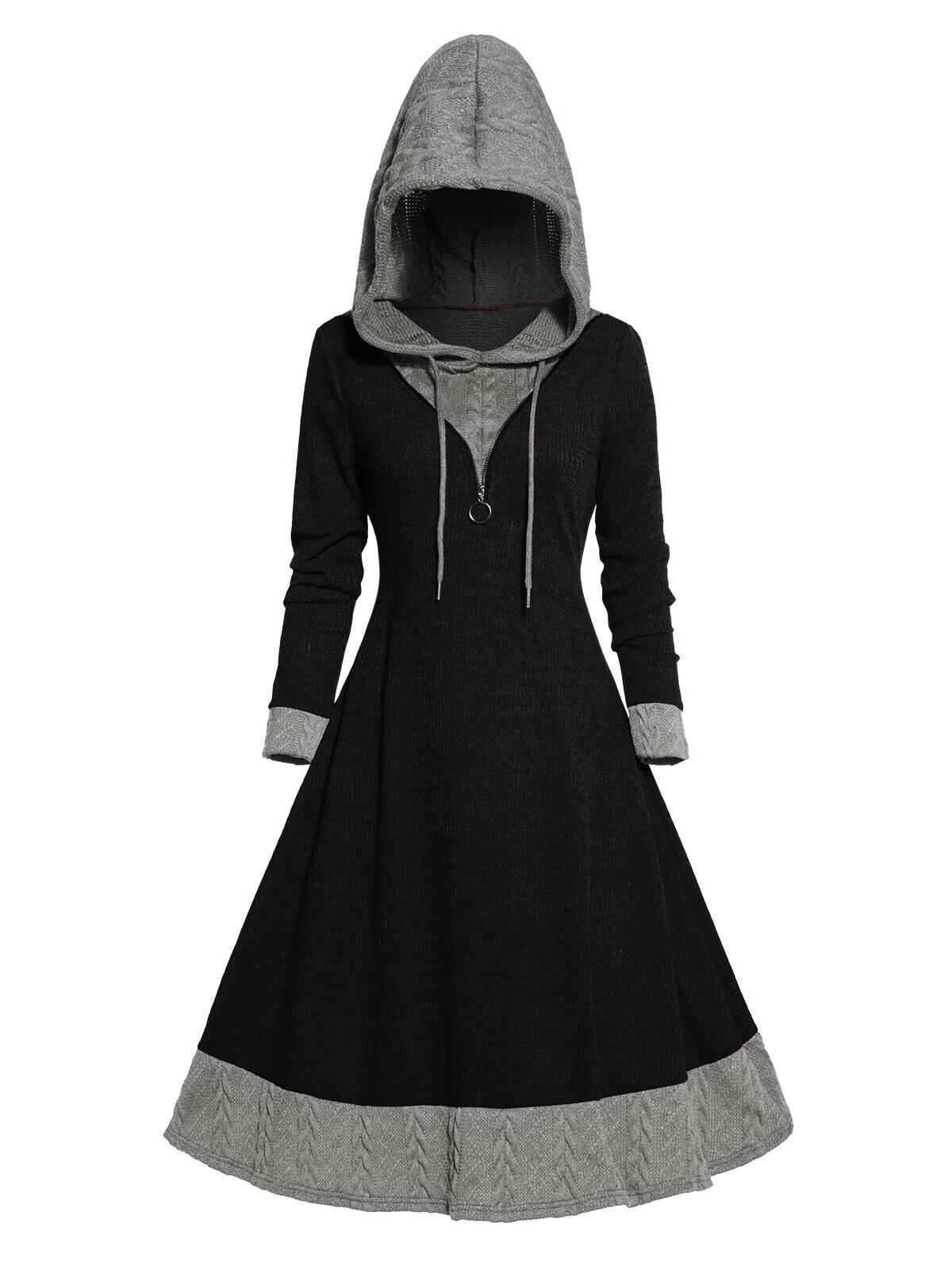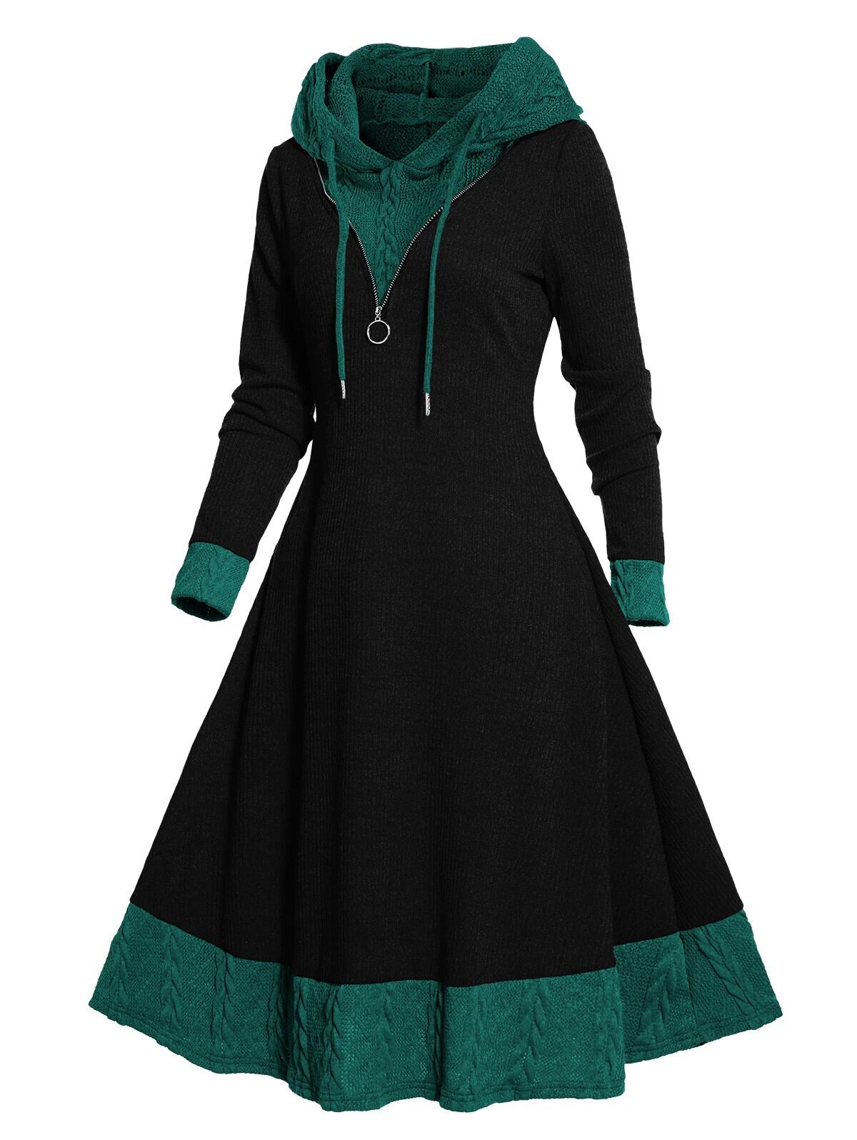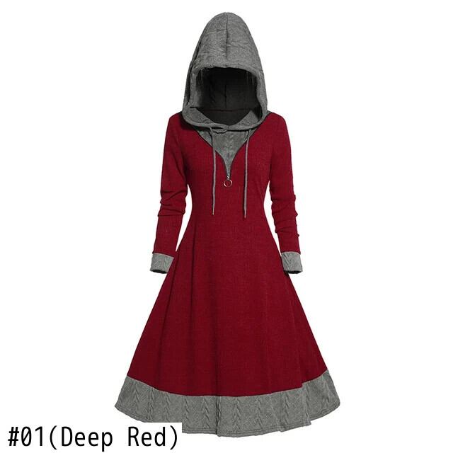 送料無料 秋カラーブロックテクスチャードニットフード付きドレス女性 O リングジッパー長袖巾着フードニット Vestido Feminino ロング レッド 指輪 AE1212665655614323750444