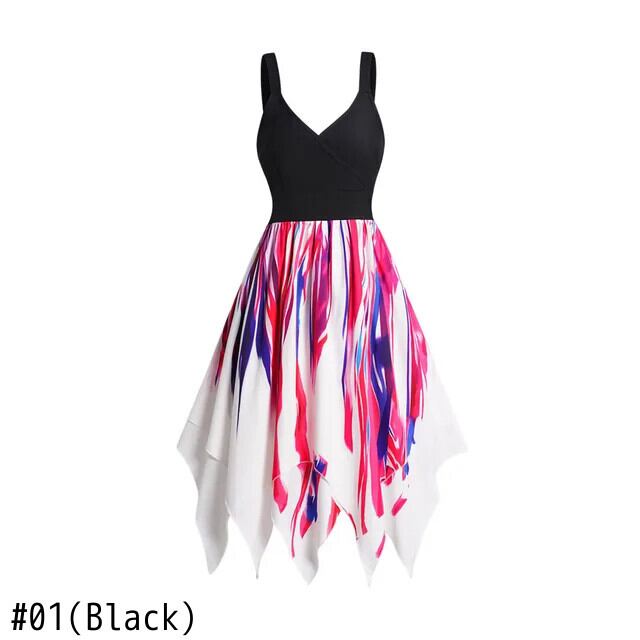 送料無料 V ネック夏デイリー冥衣ドレス 2023 ドーパミンカラフルなプリントハンカチ裾ミディローブ サマー 夏物 AE1212665655648790493047