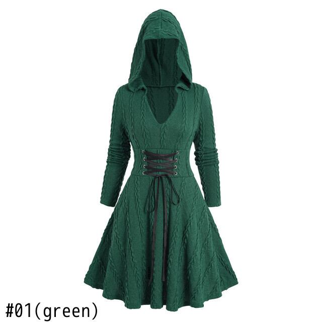 送料無料 女性グリーンレースアップツイストケーブルニットフード付きセータードレス無地ノッチミニ Vestido Feminino ソリッドカラー AE1212665655673772458494