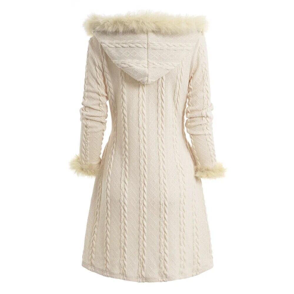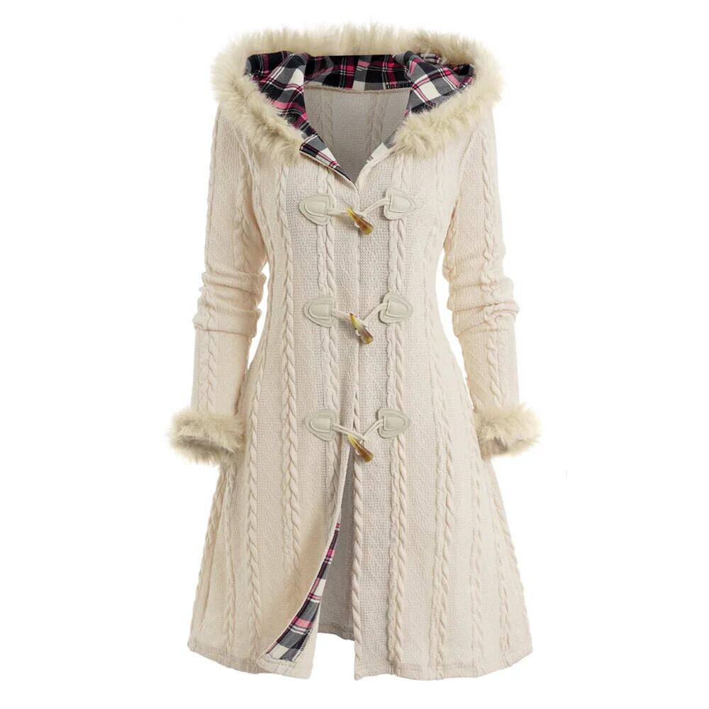 送料無料 女性暖かい冬のニットケーブルニットチェック柄フェイクファーパネルフード付きコートホーンボタンロングニットセーター ウィンター 冬物 AE1212665655651130857843