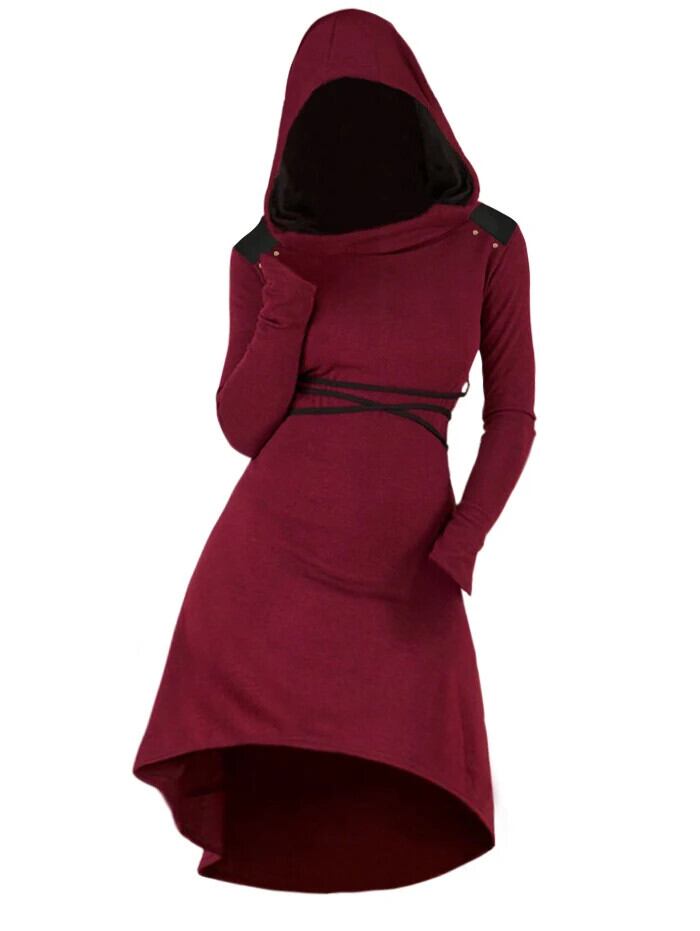 送料無料 カラーブロックローフード付きドレスベルト付き長袖ミディ Jurken フード付き長袖フード付きドレス女性 Vestido ロング ハーネス AE1212665655617411601174